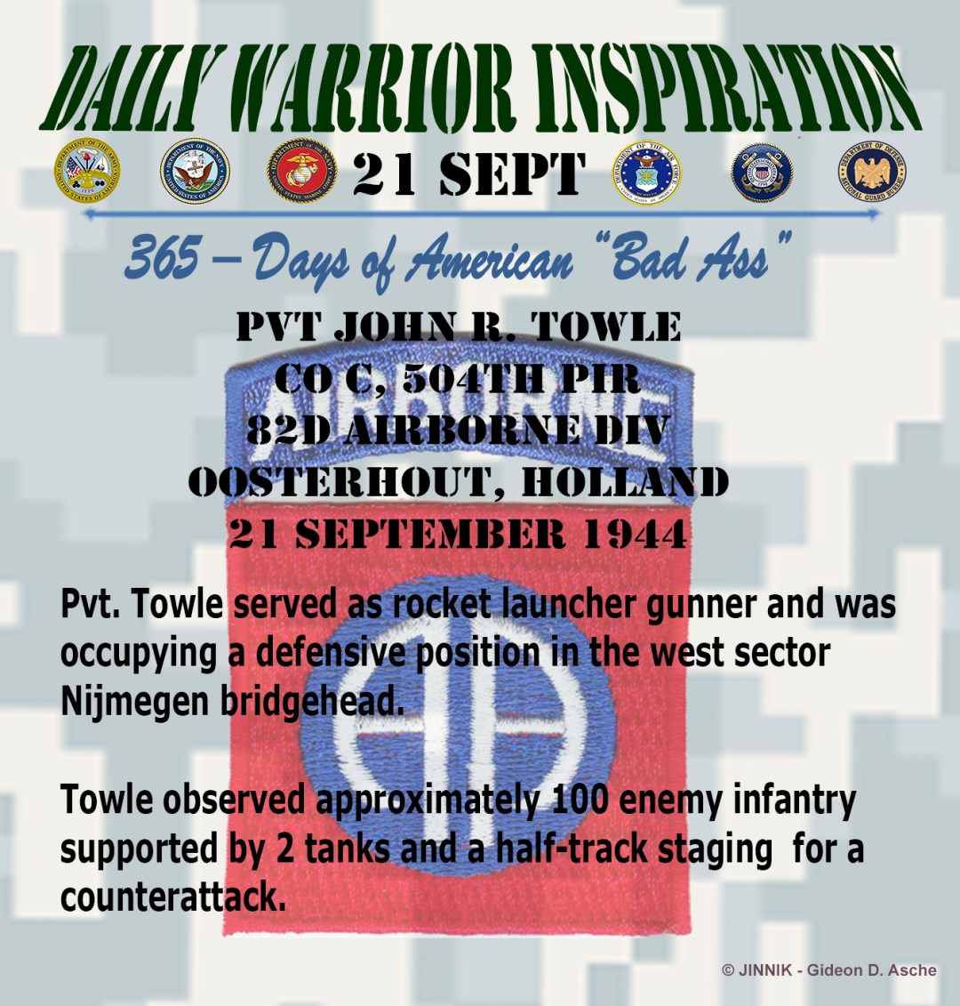 Pvt. Towle is credited with saving many Paratrooper lives and was directly instrumental in breaking up the enemy counterattack.
