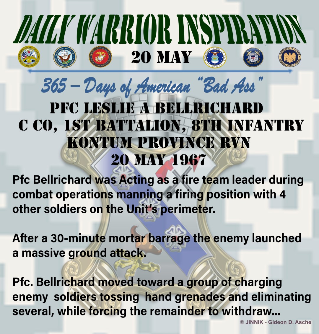 Pfc. Bellrichard was with 4 fellow soldiers in a foxhole on their unit’s perimeter when the position came under a massive enemy attack. After a 30-minute mortar barrage barrage the enemy launched a massive ground attack.