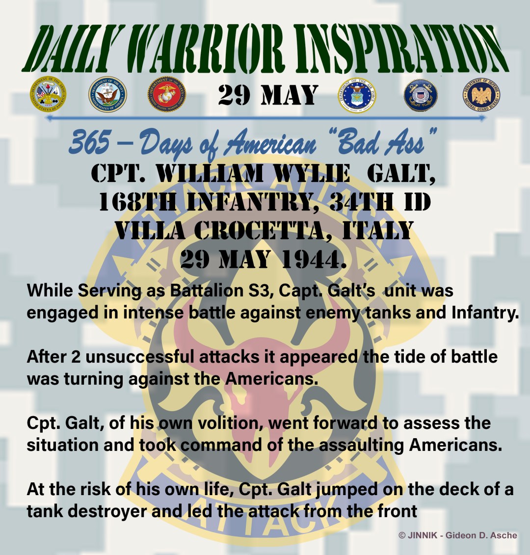 At the risk of his own life, Capt. Galt jumped on the deck of a tank destroyer and led the attack from the front.