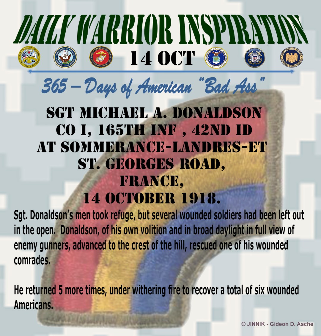 Donaldson, of his own volition and in broad daylight in full view of enemy gunners, advanced to the crest of the hill, rescued one of his wounded comrades,
