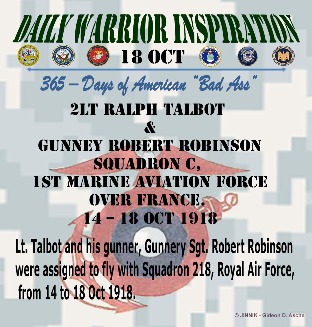 Lt. Talbot and his gunner, Gunnery Sgt. Robert Robinson were assigned to fly with Squadron 218, Royal Air Force, from 14 to 18 Oct 1918.