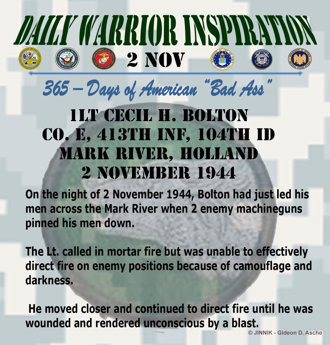 Bolton was wounded a third time on the return trip, heavy enemy fire meant that his men were at great risk if they tried to recover him so he ordered them to go on and 1Lt Bolton crawled, under enemy fire back to US lines where he collapsed from blood loss.