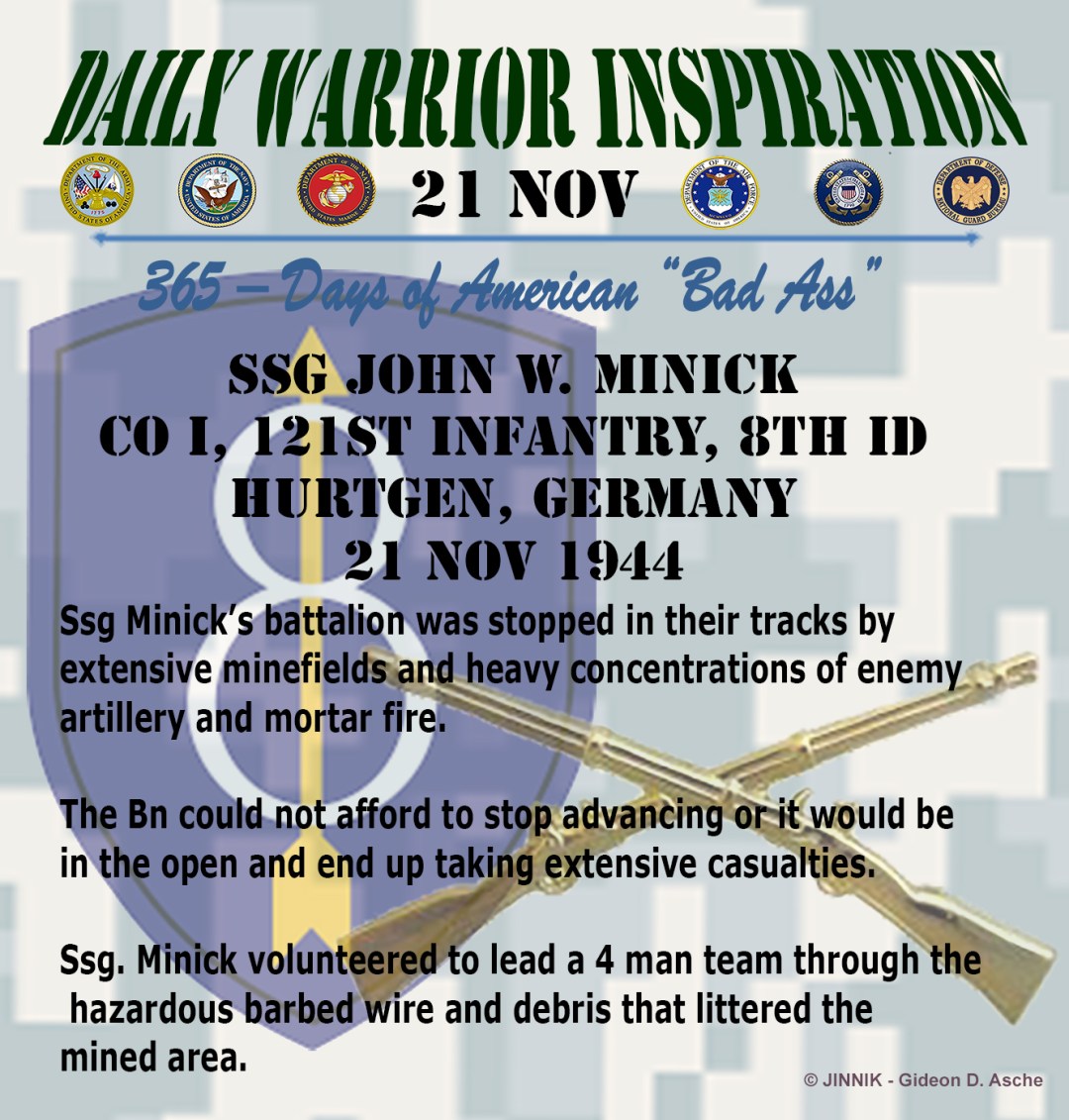 SSG. Minick volunteered to lead a 4 man team through the hazardous barbed wire and debris that littered the mined area. When they had moved approx 300 meters through the minefield an enemy gun emplacement directed their fire on the team.