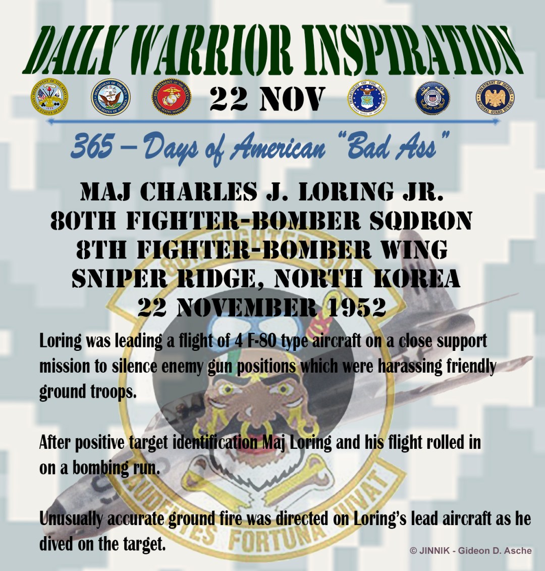 Loring was leading a flight of 4 F-80 type aircraft on a close support mission to silence enemy gun positions which were harassing friendly ground troops.