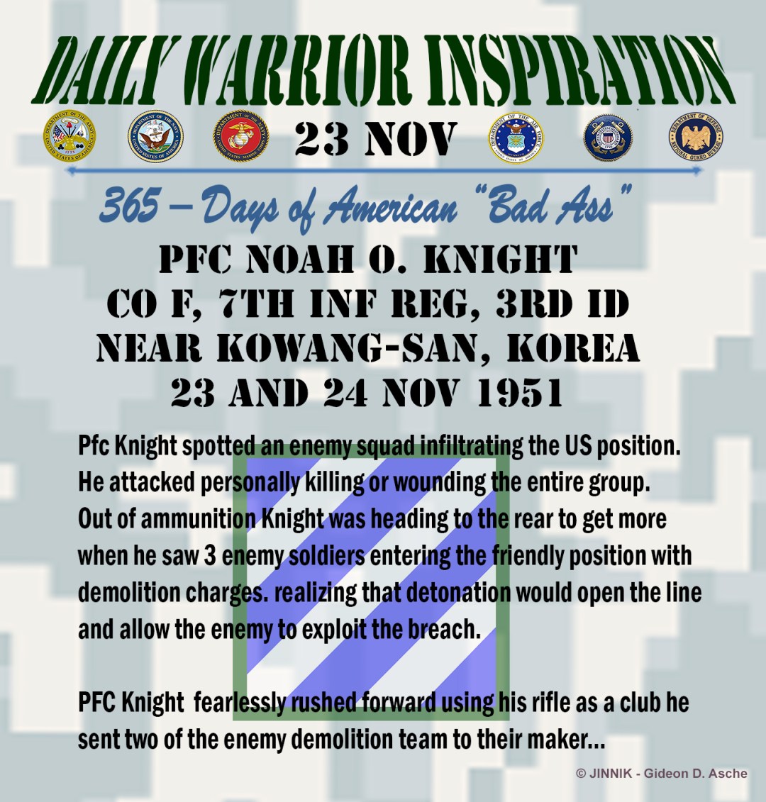 Pfc Knight was manning a key defensive position when the enemy charged his position. Two direct hits destroyed Knights bunker leaving him badly wounded and without cover.