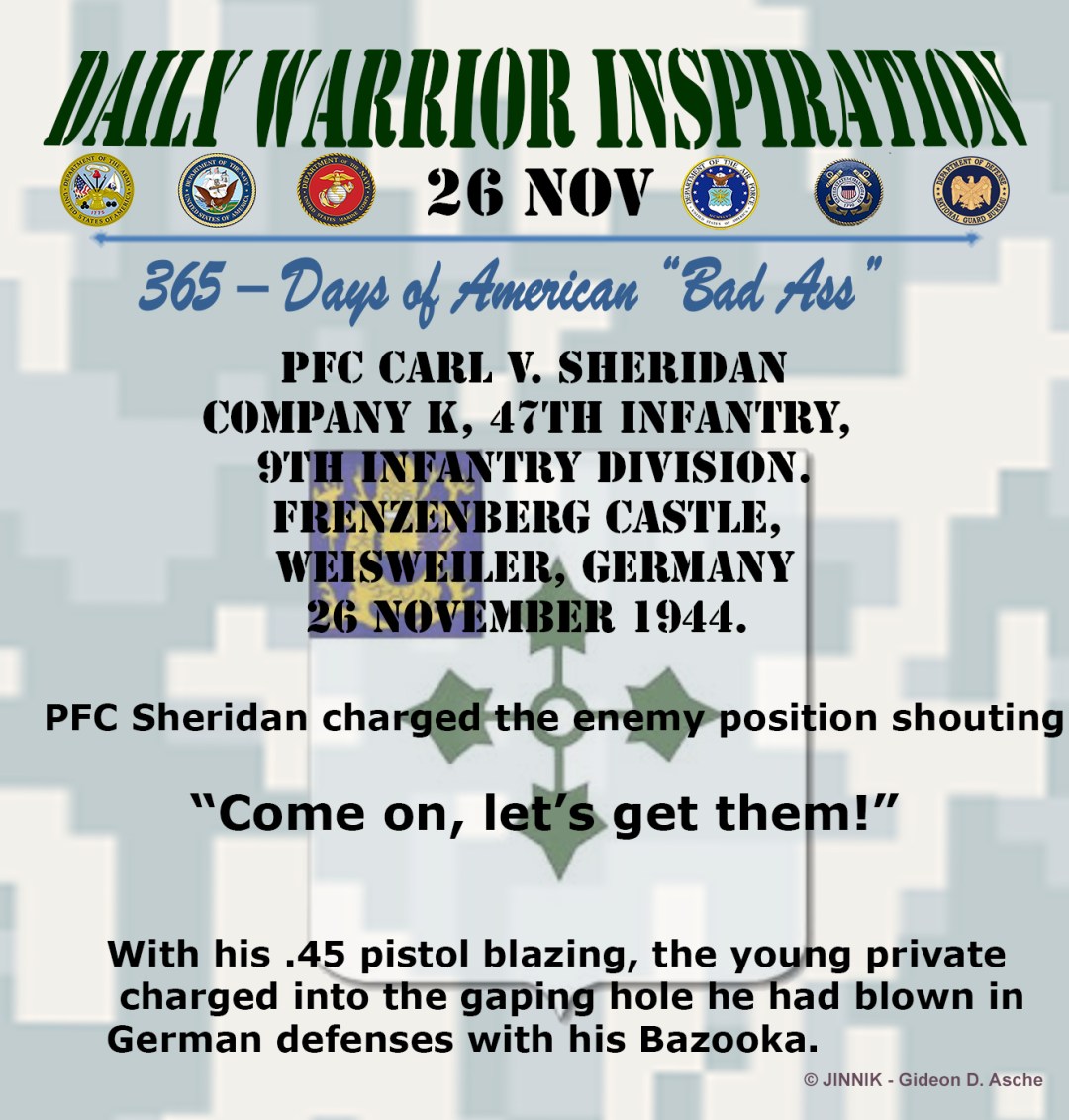 PFC Sheridan was serving as a Bazookaman with K Co, near Frenzenberg Castle Germany. After an advance of 1,000 yards through a shattering barrage of enemy artillery and mortar fire, the American platoon had captured 2 buildings in the courtyard of the castle but was left with an effective fighting strength of only 35 men.