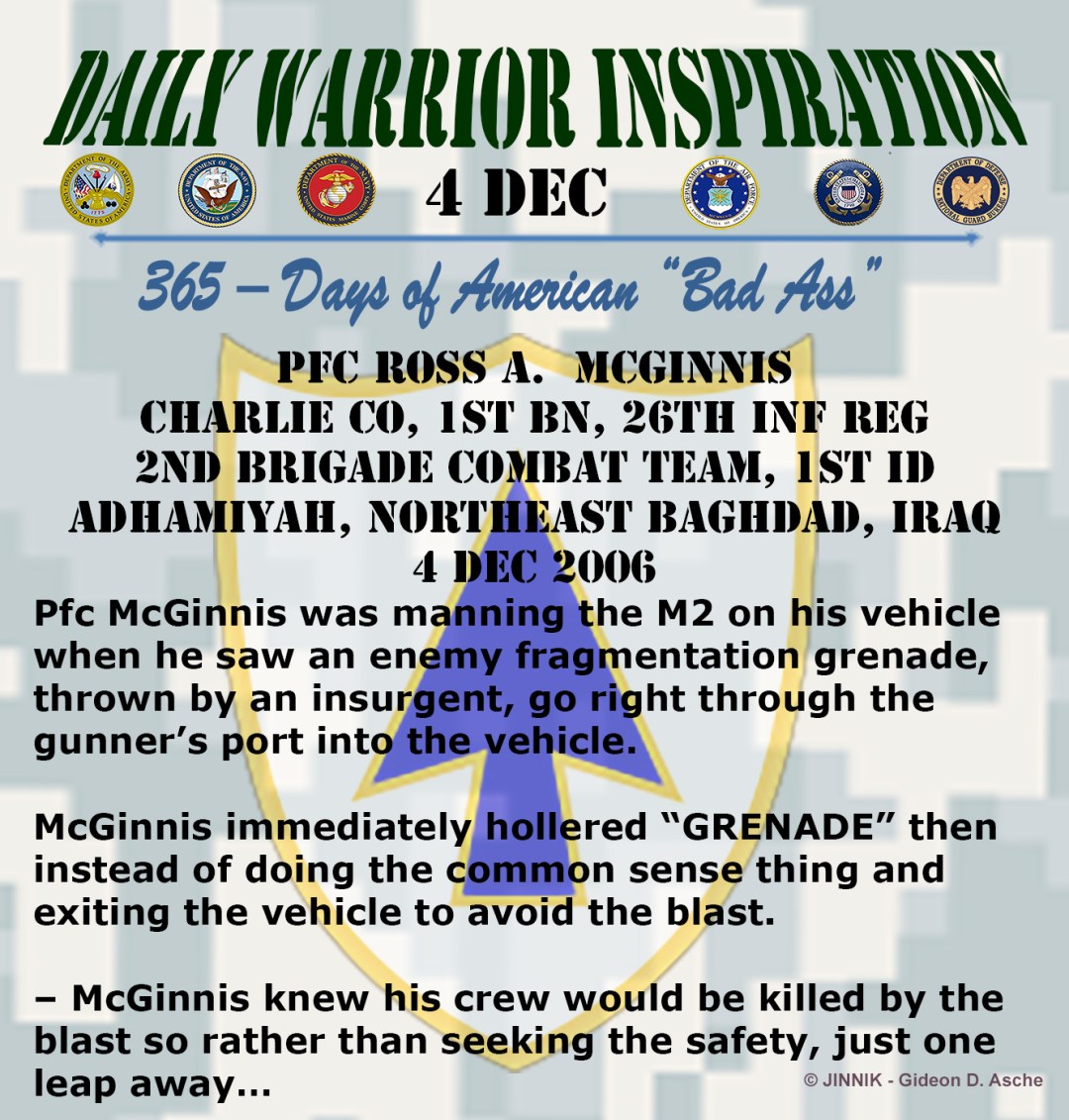 Private McGinnis covered the live grenade, pinning it between his body and the vehicle and absorbing most of the explosion. Private McGinnis’ gallant action directly saved four men from certain serious injury or death. Private First Class McGinnis’ extraordinary heroism and selflessness at the cost of his own life, above and beyond the call of duty, are in keeping with the highest traditions of the military service and reflect great credit upon himself, his unit, and the United States Army.
