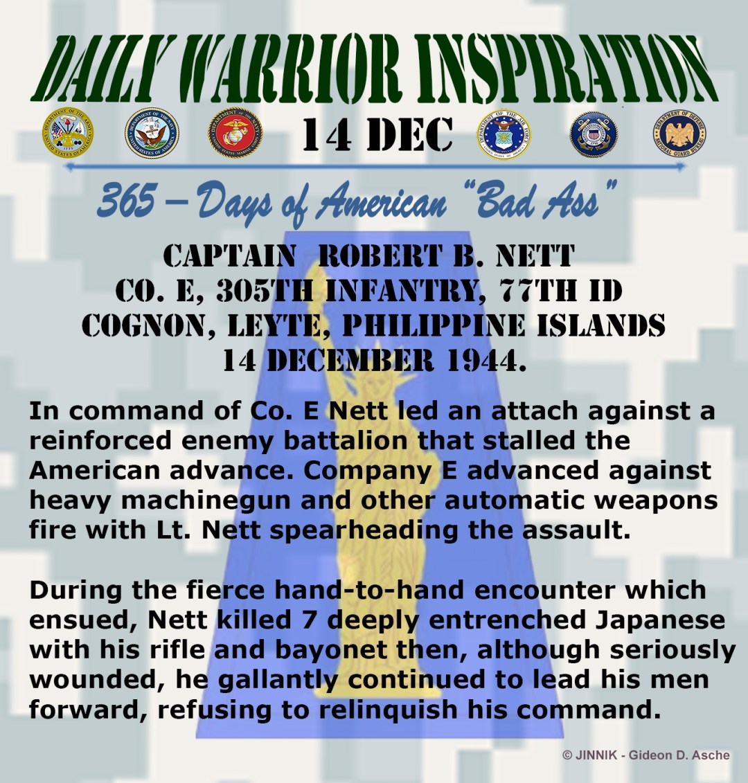 In command of Co. E Nett led an attack against a reinforced enemy battalion that stalled the American advance. Company E advanced against heavy machinegun and other automatic weapons fire with Lt. Nett spearheading the assault.