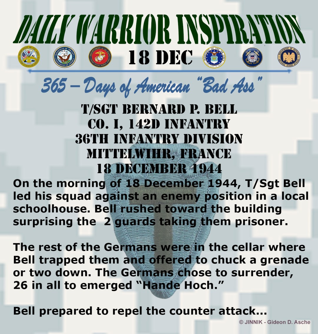 On the morning of 18 December 1944, T/Sgt Bell led his squad against an enemy position in a local schoolhouse. Bell rushed toward the building surprising the 2 guards at the door and took them prisoner without firing a shot.