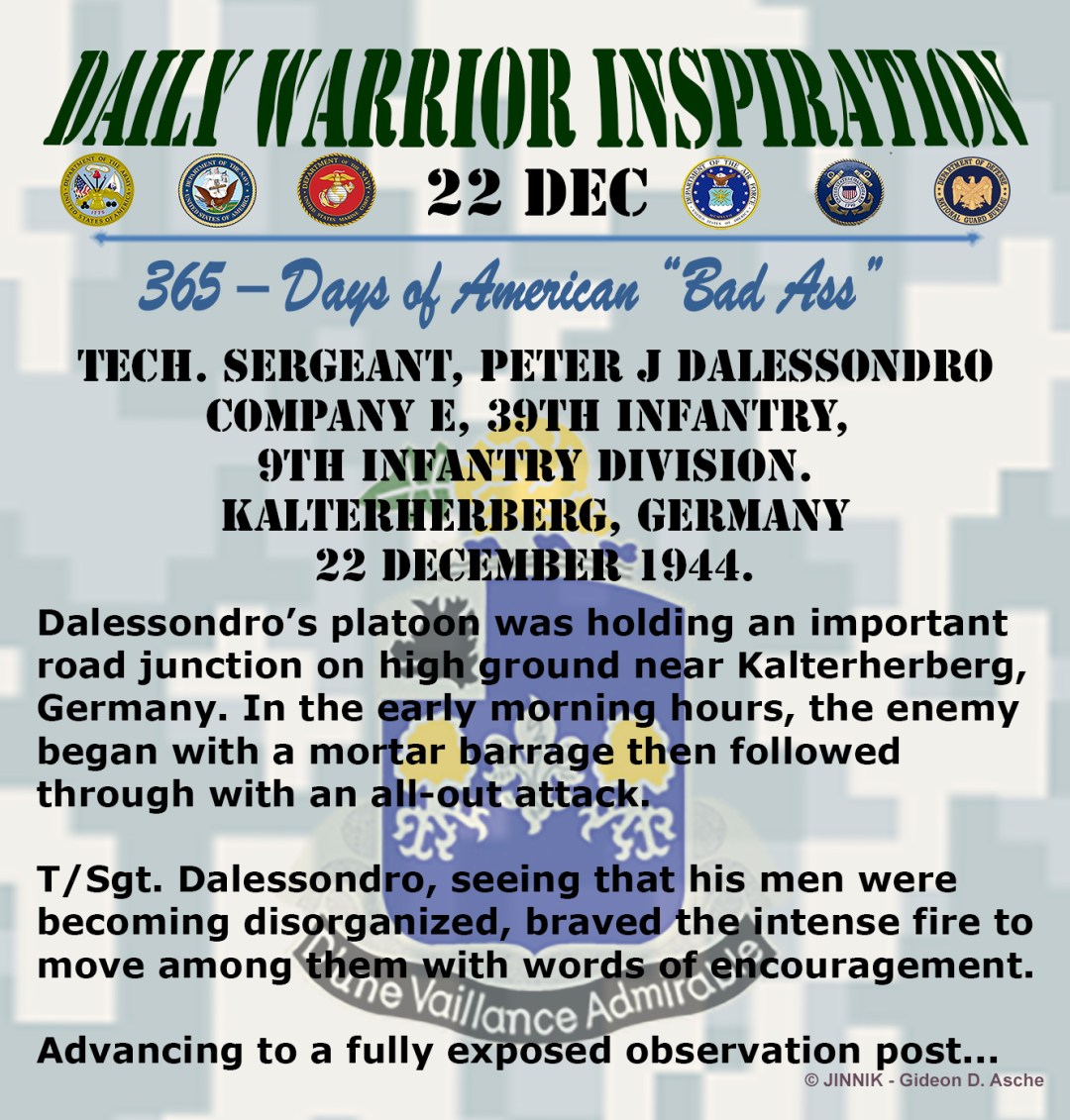 Dalessondro’s platoon was holding an important road junction on high ground near Kalterherberg, Germany, on 22 December 1944. In the early morning hours, the enemy began with a mortar barrage then followed through with an all-out attack that threatened to overwhelm the position.