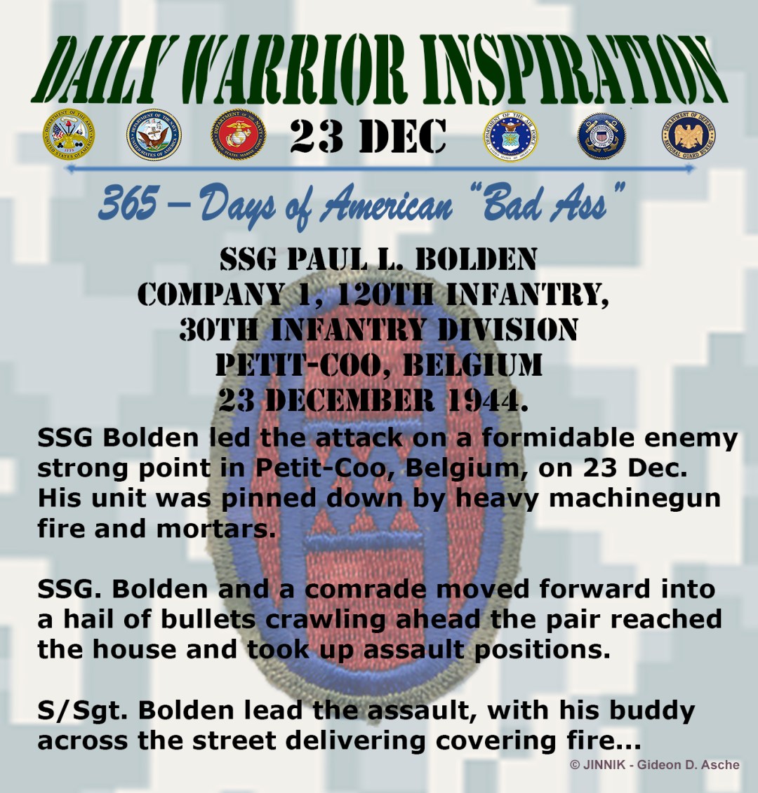 SSG Bolden led the attack on a formidable enemy strong point in Petit-Coo, Belgium, on 23 December 1944. His unit was pinned down by heavy machinegun fire and mortars.