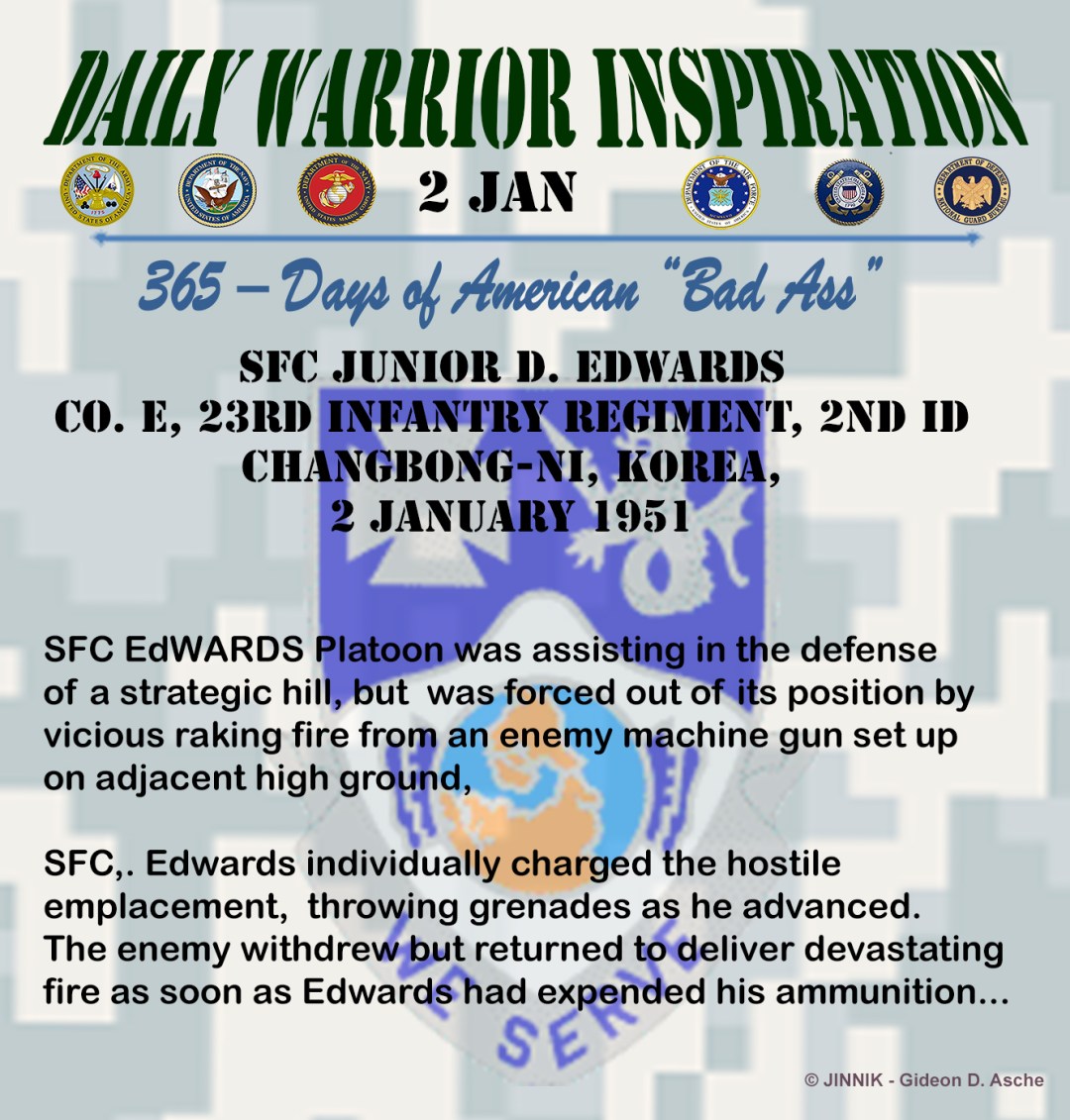 SFC Edwards’ consummate valor and gallant self-sacrifice reflect the utmost glory upon himself and are in keeping with the esteemed traditions of the infantry and military service.