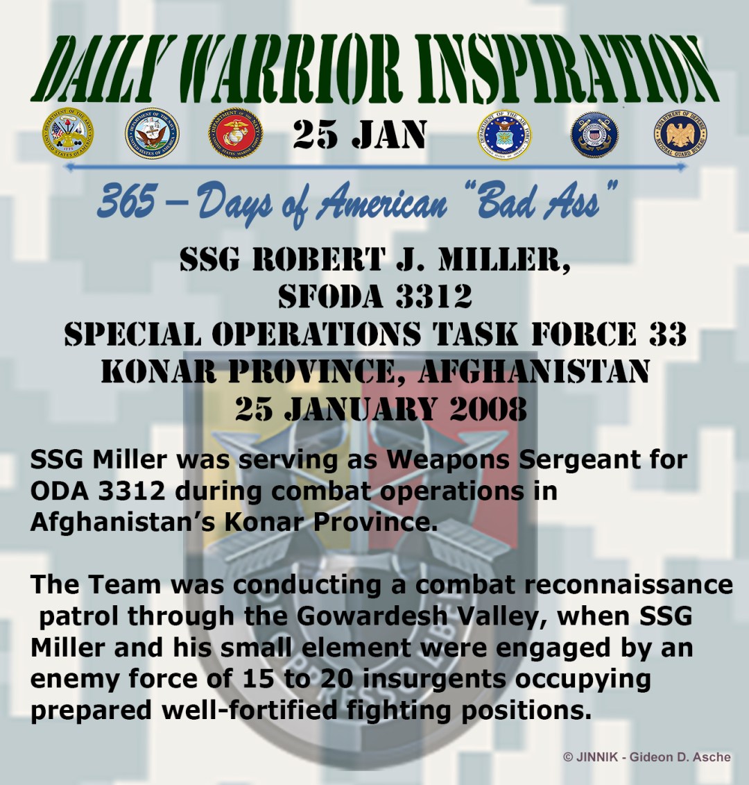 Then, in spite of overwhelming enemy fire, Miller charged the enemy positions providing covering fire for his men. SSG Miller was shot in his upper torso. Ignoring the gunshot, Miller continued to take the fight to the enemy and drawing fire from over one hundred enemy fighters upon himself.