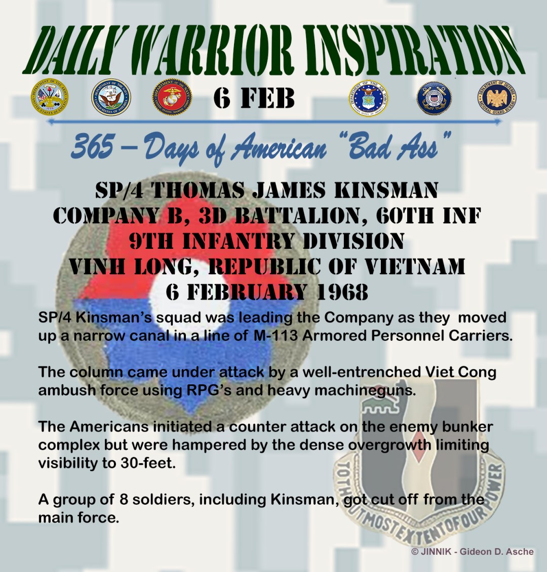“Through his indomitable courage, complete disregard for his personal safety and profound concern for his fellow soldiers, Sp4c. Kinsman averted loss of life and injury to the other 7 men of his element. Sp4c. Kinsman’s extraordinary heroism at the risk of his life, above and beyond the call of duty, are in keeping with the highest traditions of the military service and reflect great credit upon himself, his unit, and the U.S. Army.”