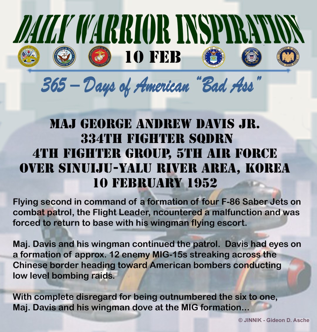 Maj. Davis’ bold attack completely disrupted the enemy formation, permitting the friendly fighter-bombers to successfully complete their interdiction mission. Maj. Davis, by his indomitable fighting spirit, heroic aggressiveness, and superb courage in engaging the enemy against formidable odds exemplified valor at its highest.