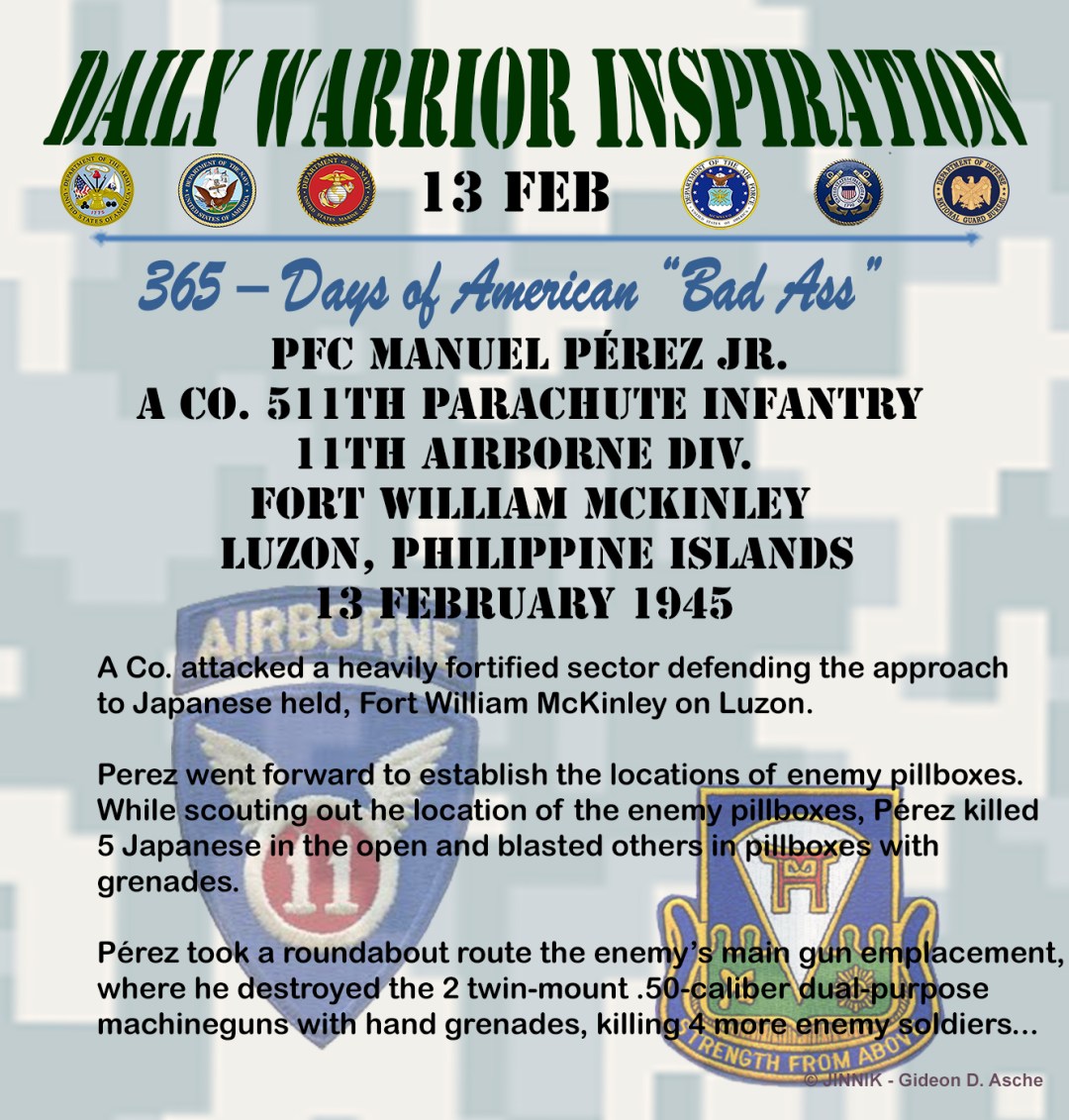 William McKinley on Luzon. Perez went forward to establish the locations of enemy pillboxes. While scouting out the location of the enemy pillboxes, Pérez killed 5 Japanese in the open and blasted others in pillboxes with grenades.