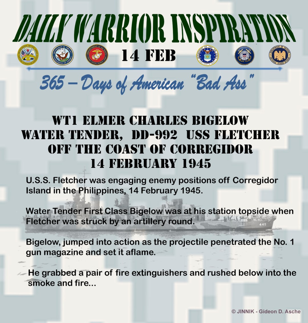 U.S.S. Fletcher was engaging enemy positions off Corregidor Island in the Philippines, 14 February 1945. Water Tender First Class Bigelow was at his station topside when Fletcher was struck by an artillery round.