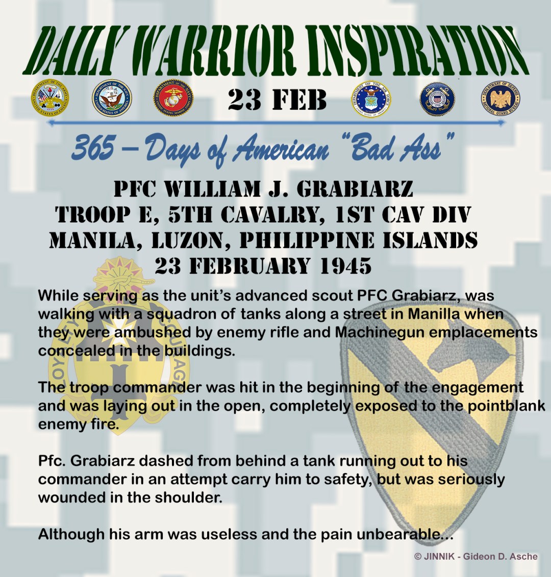 Pfc. Grabiarz dashed from behind a tank running out to his commander in an attempt to carry him to safety but was seriously wounded in the shoulder.