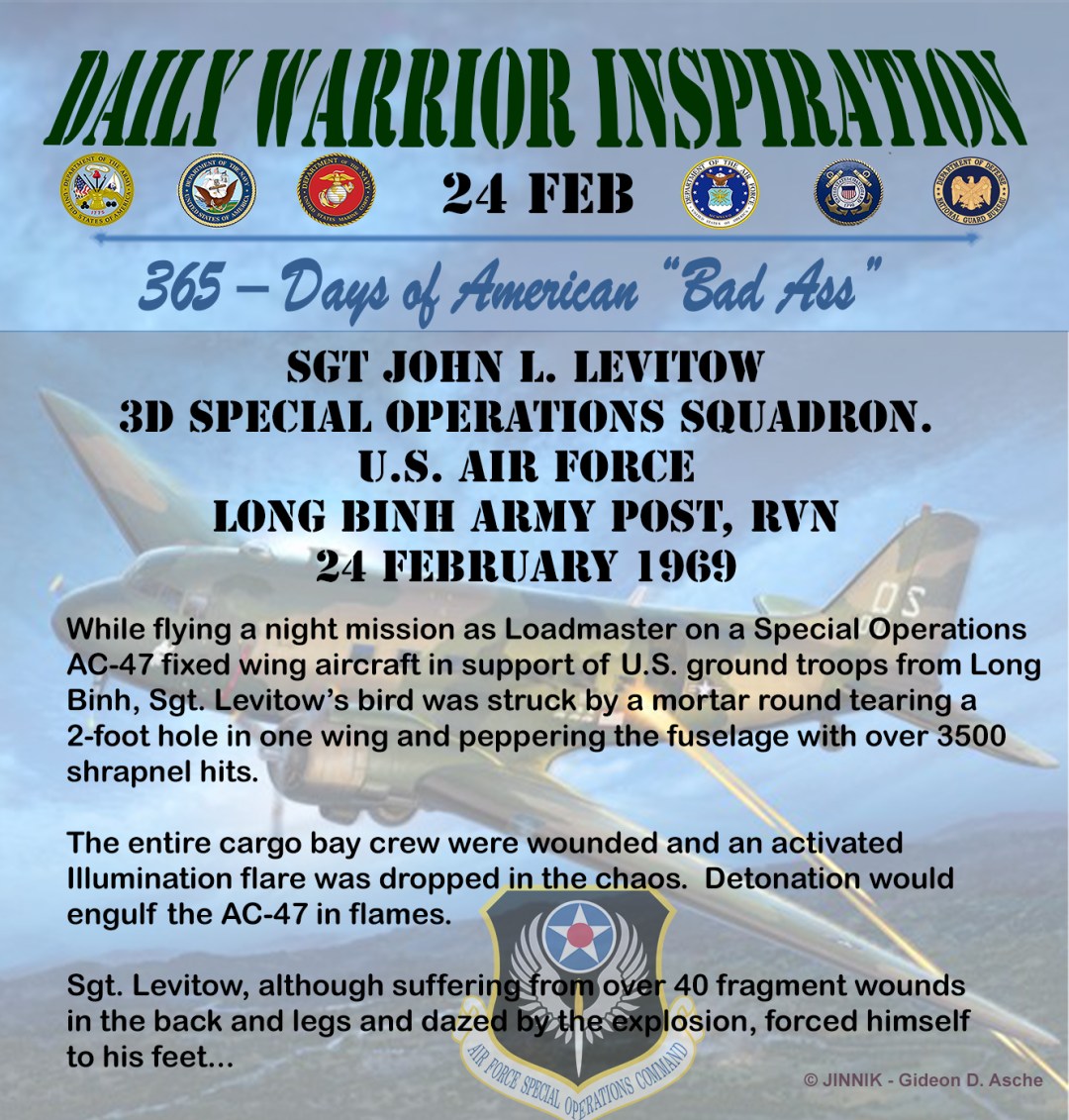 aircraft in support of ground troops from Long Binh, Sgt. (then A1c.) Levitow’s aircraft was struck by a mortar round tearing a 2-foot hole in one wing and peppering the fuselage with over 3500 shrapnel hits.