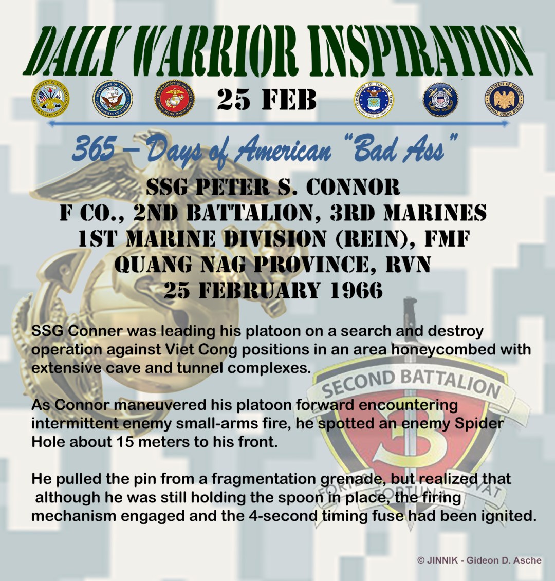 His (SSG Conner) act of extreme valor and selflessness in the face of virtually certain death, although leaving him mortally wounded, spared many of his fellow marines from death or injury. His gallant action in giving his life in the cause of freedom reflects the highest credit upon the Marine Corps and the Armed Forces of the United States.