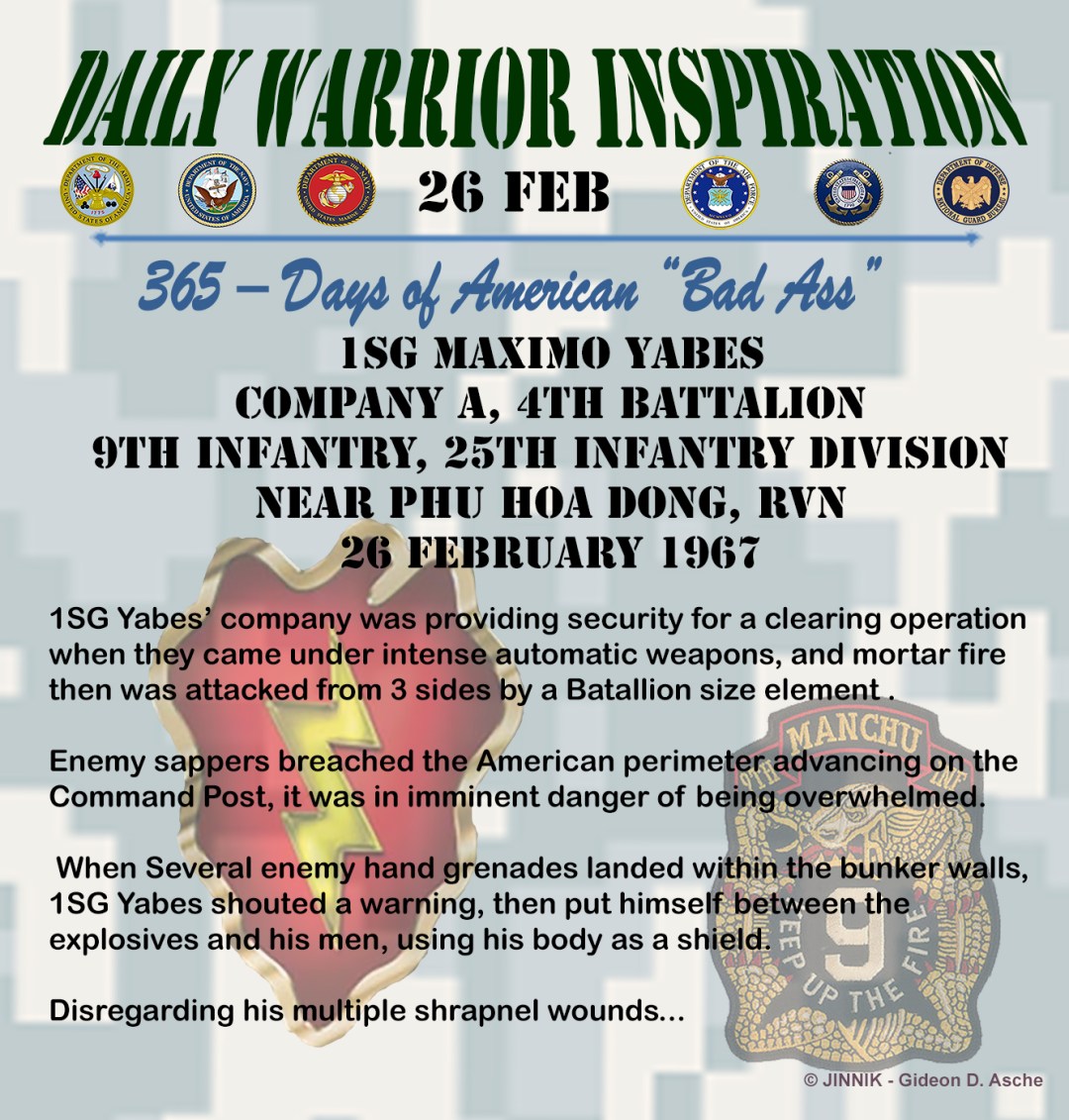 The enemy breached the American perimeter advancing on the Command Post. Bunker. Enemy fire was concentrated on the CP Bunker. With sappers approaching, it was in imminent danger of being overwhelmed. When Several enemy hand grenades landed within the bunker walls, 1SG Yabes shouted a warning, then put himself between the explosives and his men using his body as a shield to protect others in the bunker.
