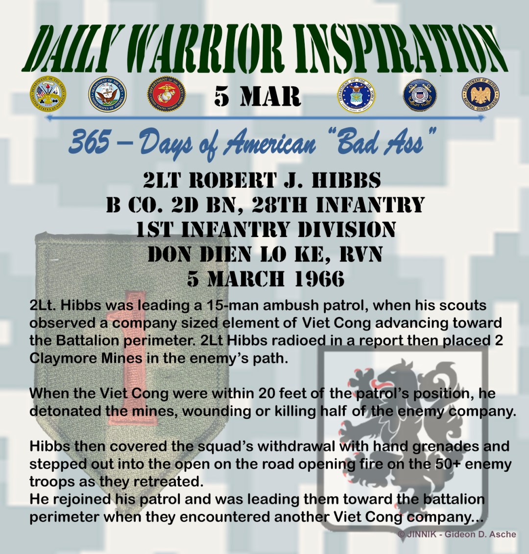 Hibbs then covered the squad’s withdrawal with hand grenades and stepped out into the open on the road opening fire on the 50+ enemy troops as they retreated. He rejoined his patrol and was leading them toward the battalion perimeter when they encountered elements of another Viet Cong company. Knowing he had the advantage of surprise, 2Lt. Hibbs led a charge against the enemy force completely disrupting their attack.