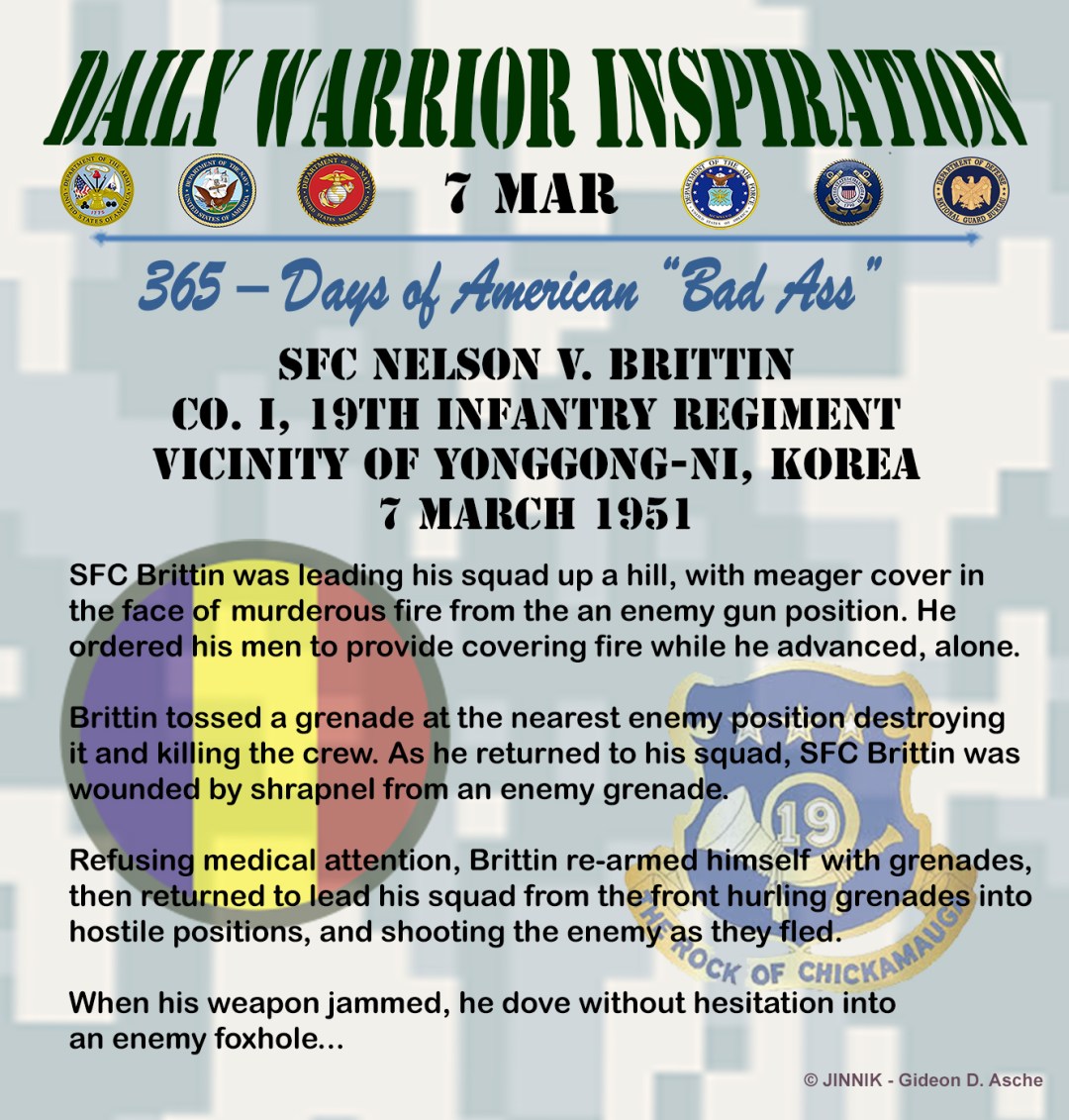 Brittin tossed a grenade at the nearest enemy position destroying it and killing the crew. As he returned to his squad, SFC Brittin was wounded by shrapnel from an enemy grenade.
