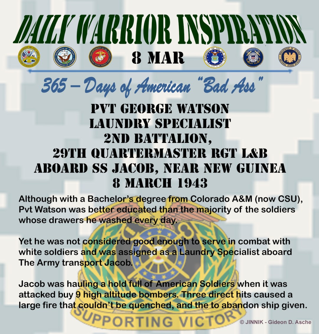 Jacob was hauling a hold full of American Soldiers when it was attacked by 9 high altitude bombers. Three direct hits caused a large fire that couldn’t be quenched, and the to abandon ship given. Watson, a strong swimmer, remained in the water. Instead of trying to save himself, the Laundry Specialist assisted soldiers who could not swim into life rafts.