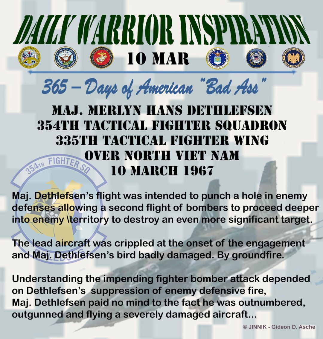 The lead aircraft was crippled at the onset of the engagement and Maj. Dethlefsen’s bird badly damaged. By groundfire. Understanding the impending fighter bomber attack depended on his flight’s suppression of enemy defensive fire, Maj. Dethlefsen paid no mind to the fact he was outnumbered and outgunned, with a severely damaged aircraft, Dethlefsen pressed on the attack.