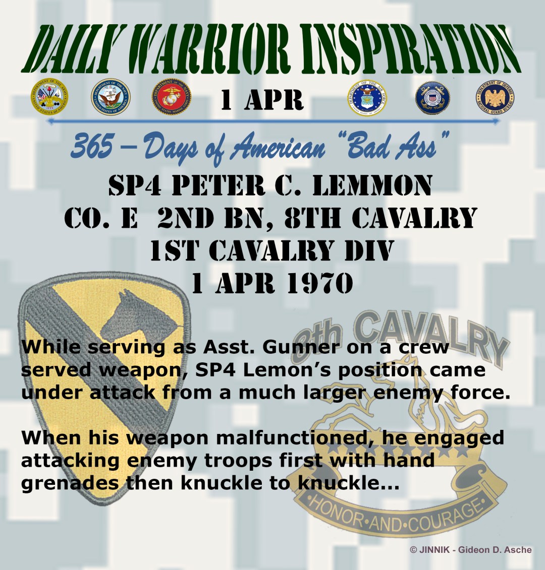 “After regaining consciousness at the aid station he refused medical evacuation until his more seriously wounded comrades had been evacuated. Sgt. Lemon’s gallantry and extraordinary heroism are in keeping with the highest traditions of the military service and reflect great credit on him, his unit, and the U.S. Army.”