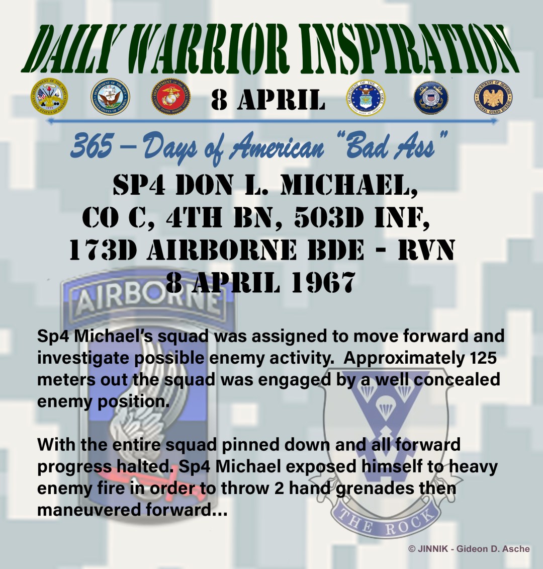 He crawled back to a friendly fox hole and commandeered more hand grenades then crawled back into the fight to deliver them to enemy positions. As he neared a bunker, an enemy soldier attacked him from a concealed position. SP/4 Michael summarily dispatched him and, was successful in destroying the enemy positions.