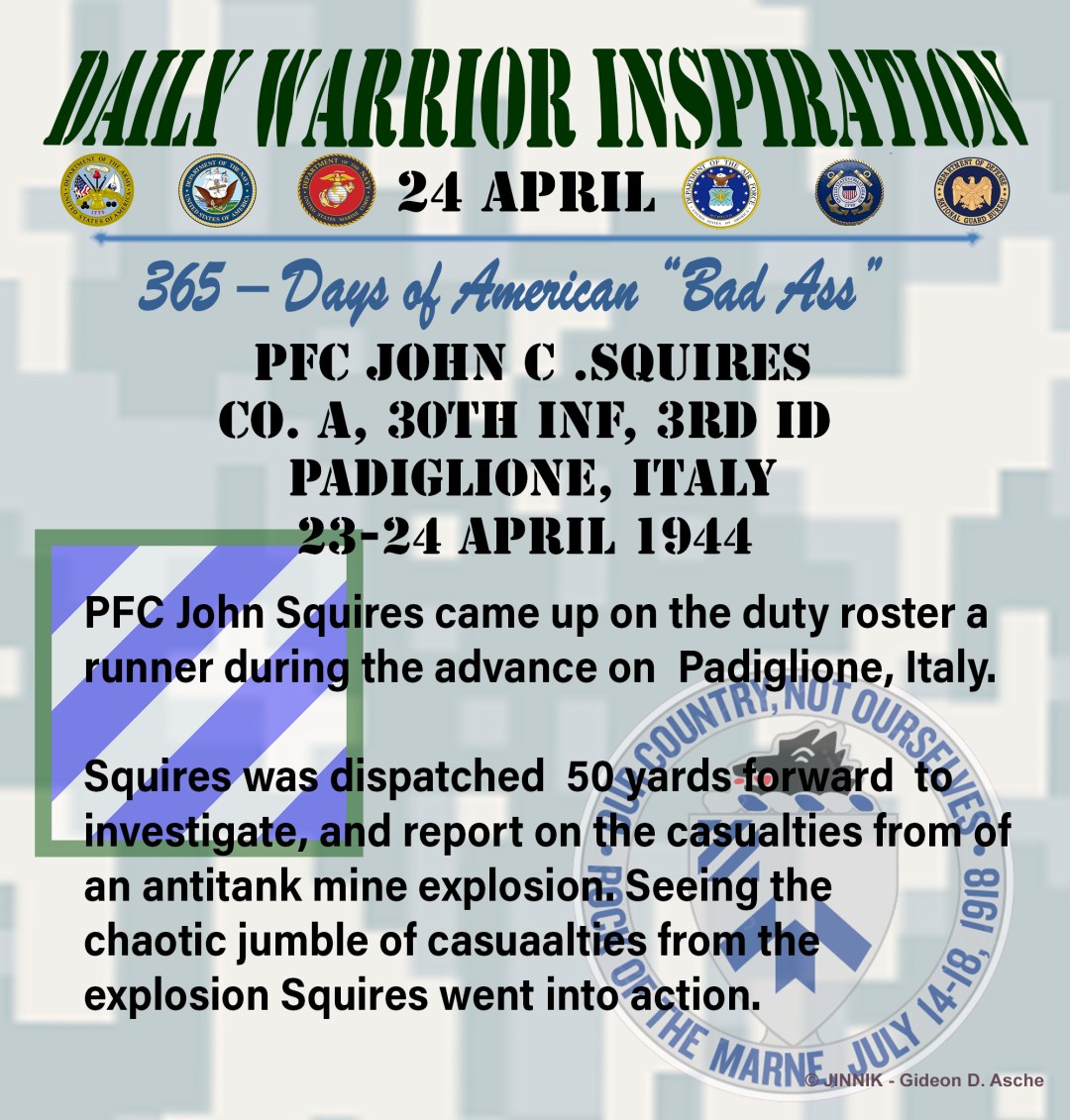 On the night of 23-24 April, PFC. Squires, made his way 50 yards forward to the advance element in order to investigate the effects of an antitank mine explosion on the leading platoon.