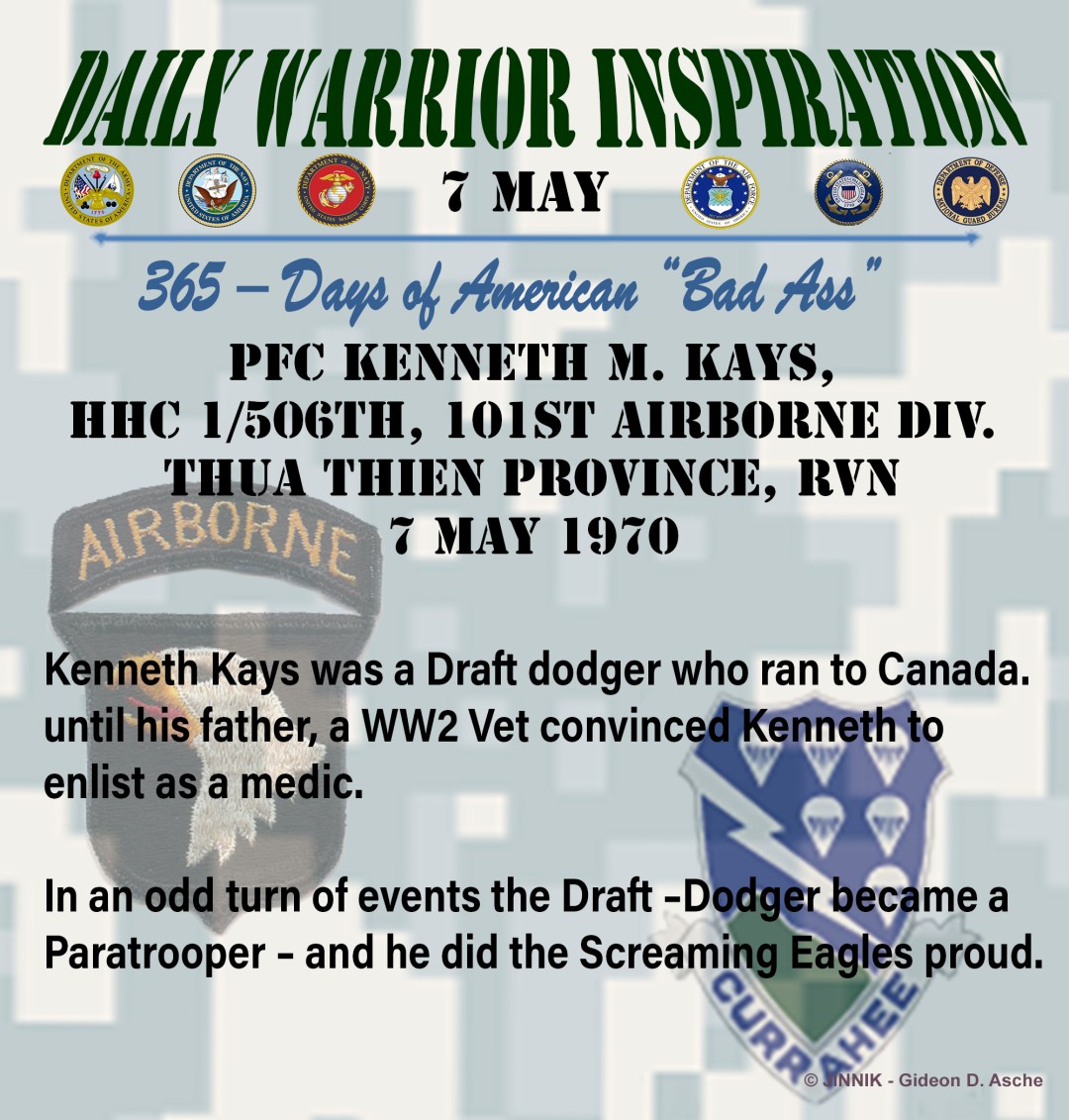 Vet, convinced Kenneth to return to the US and enlist as a medic. In an odd turn of events, the Draft –Dodger became a Paratrooper, A combat Medic – and he did the Screaming Eagles proud.