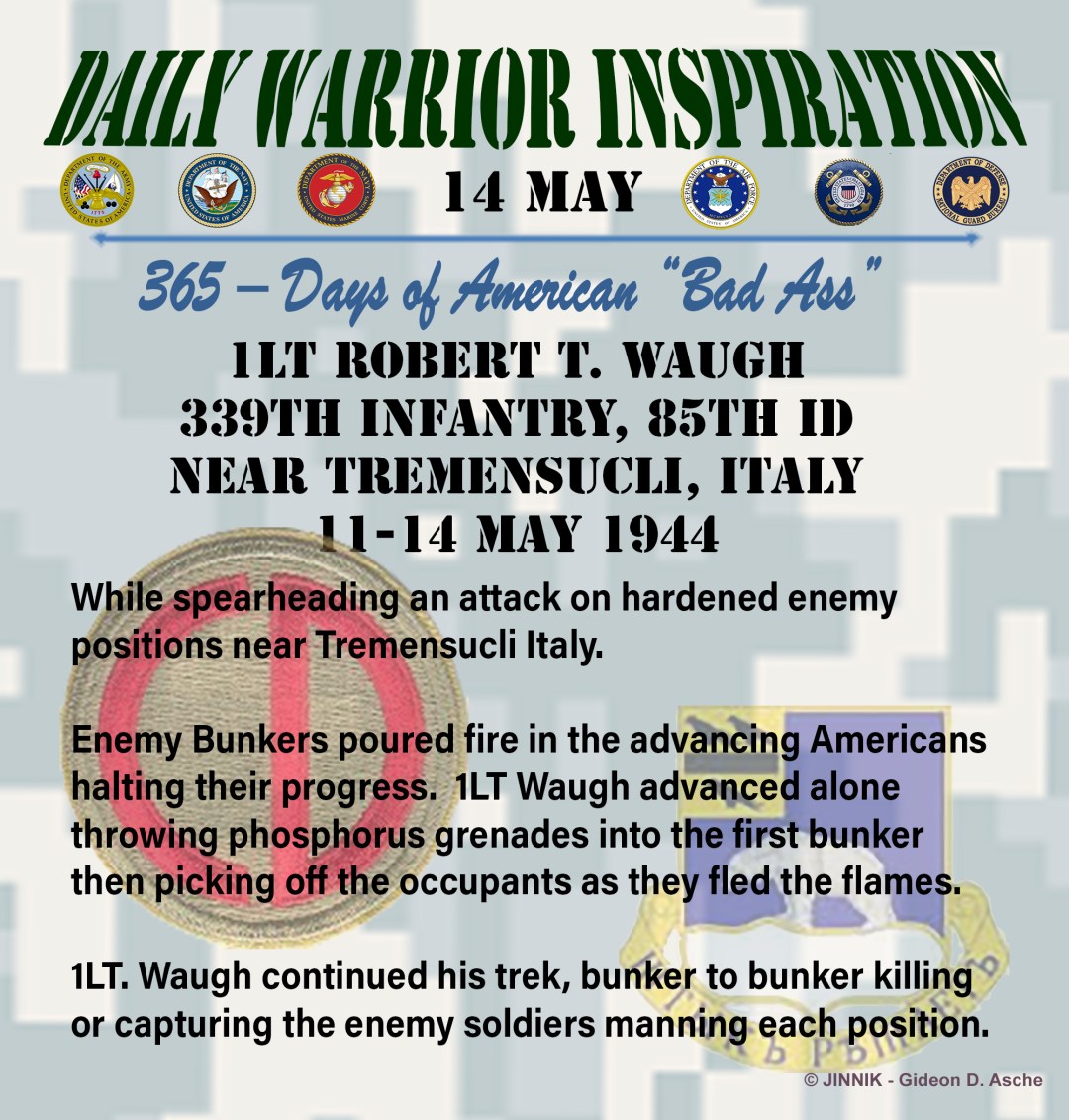 to quote 1LT Waugh’s MOH citation – “The fearless actions of 1st Lt. Waugh broke the Gustav Line at that point, neutralizing 6 bunkers and 2 pillboxes and he was personally responsible for the death of 30 of the enemy and the capture of 25 others.”