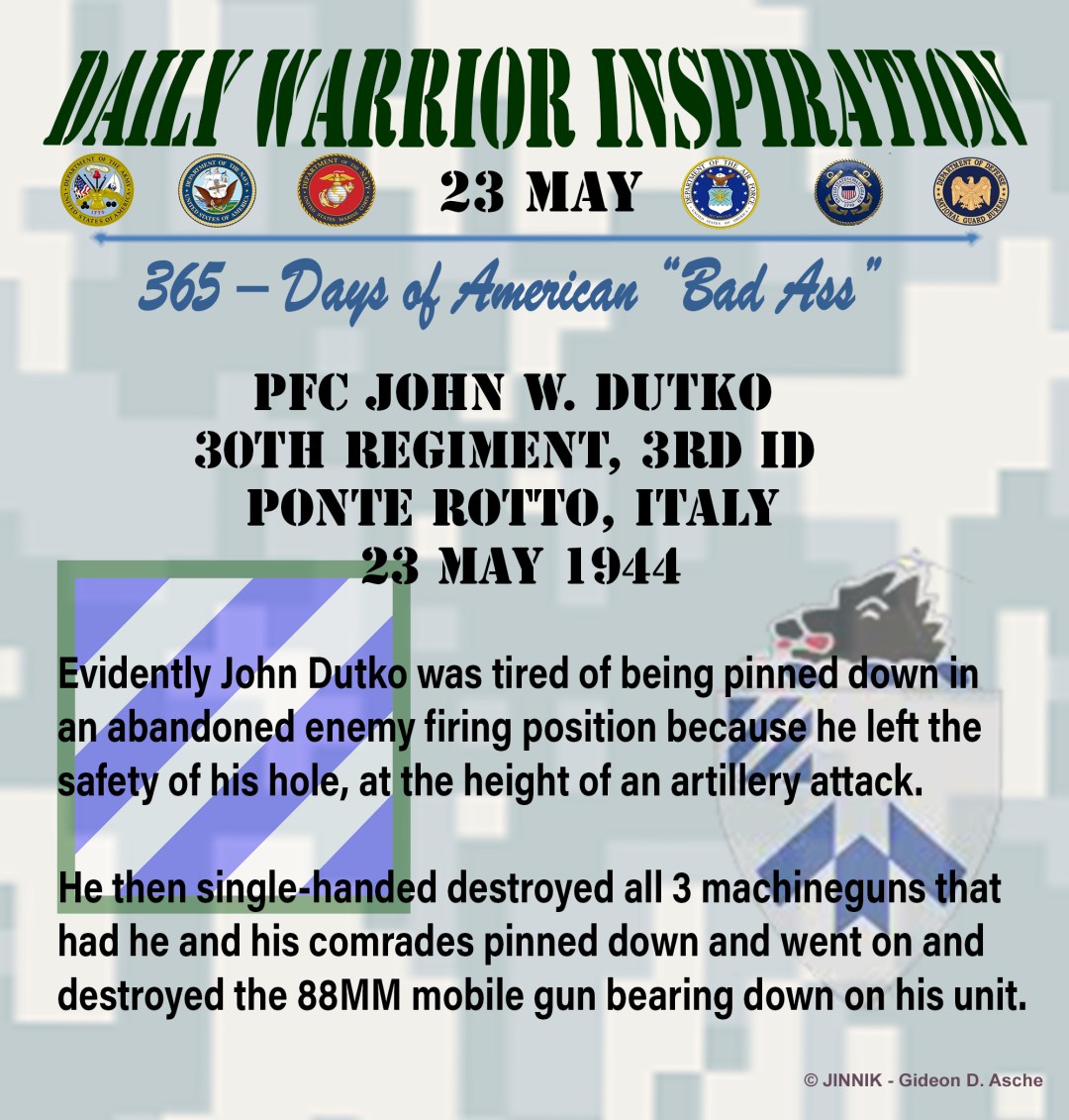 Evidently, John Dutko was tired of being pinned down in an abandoned enemy firing position because he left the safety of his hole, at the height of an artillery attack. He then single-handed destroyed all 3 machineguns that had he and his comrades pinned down.