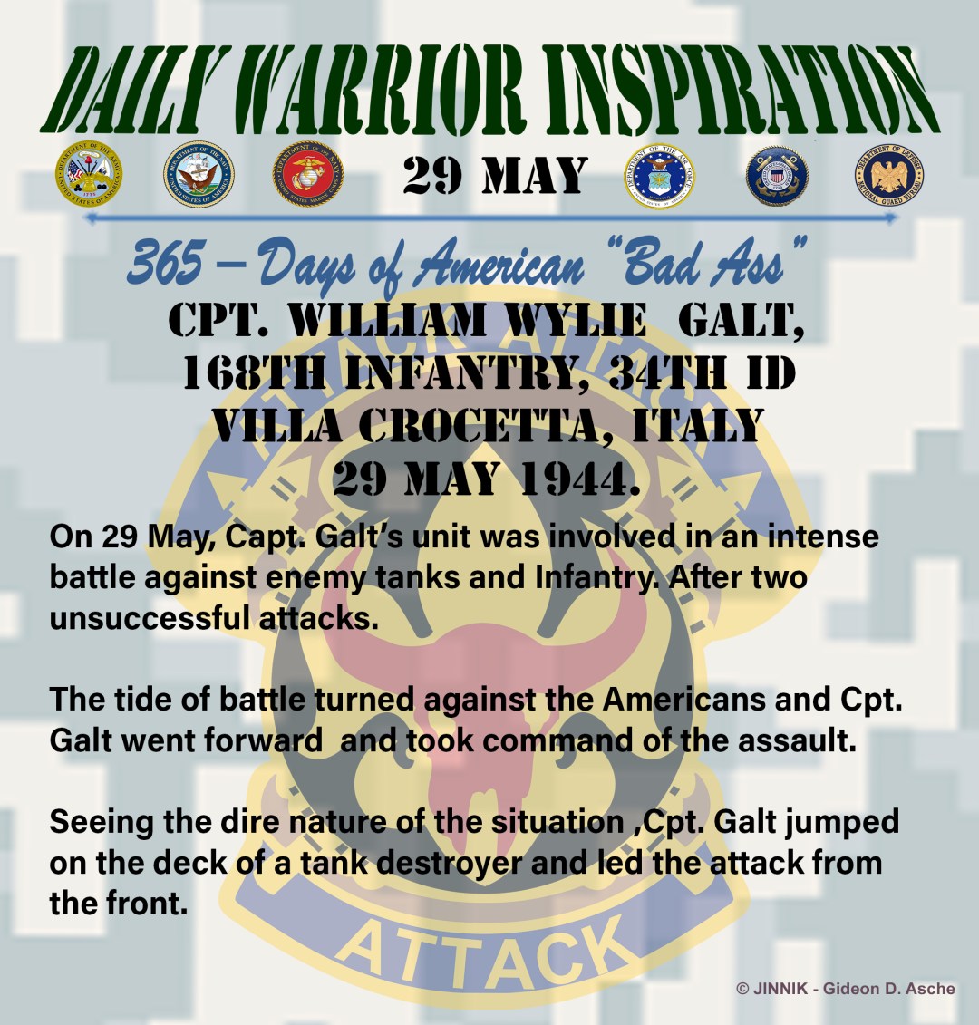 Galt’s tank destroyer was struck a few minutes later by an 88mm round. Capt. Galt fell mortally wounded across his machinegun. He had personally killed more than 40 enemy soldiers and wounded many more, securing the day for his fellow Americans.