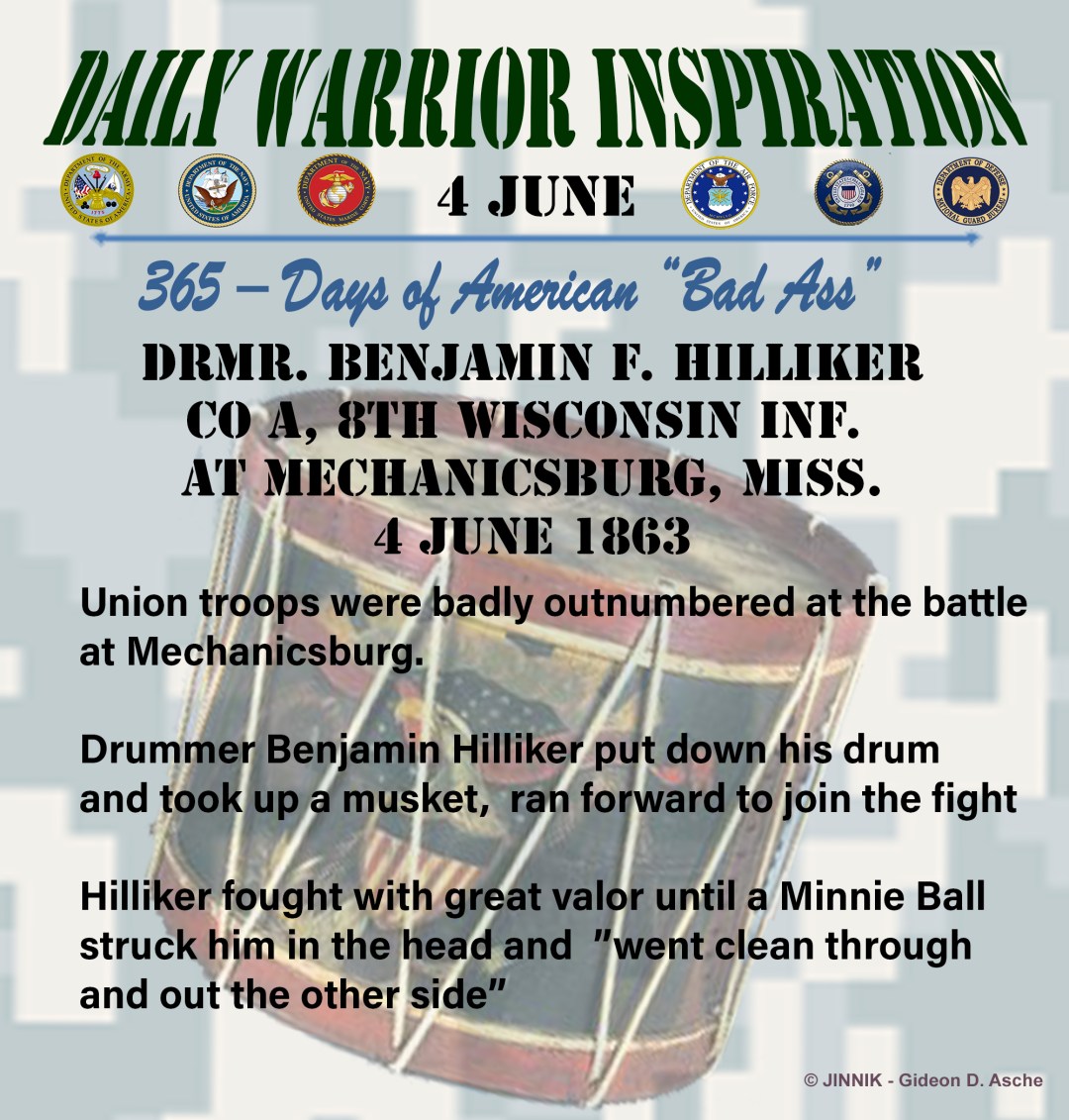 Union troops were badly outnumbered at the battle at Mechanicsburg, the drummer Benjamin Hilliker put down his drum and took up a musket and ran forward to join the fight, crawling forward to engage the enemy at close quarters.