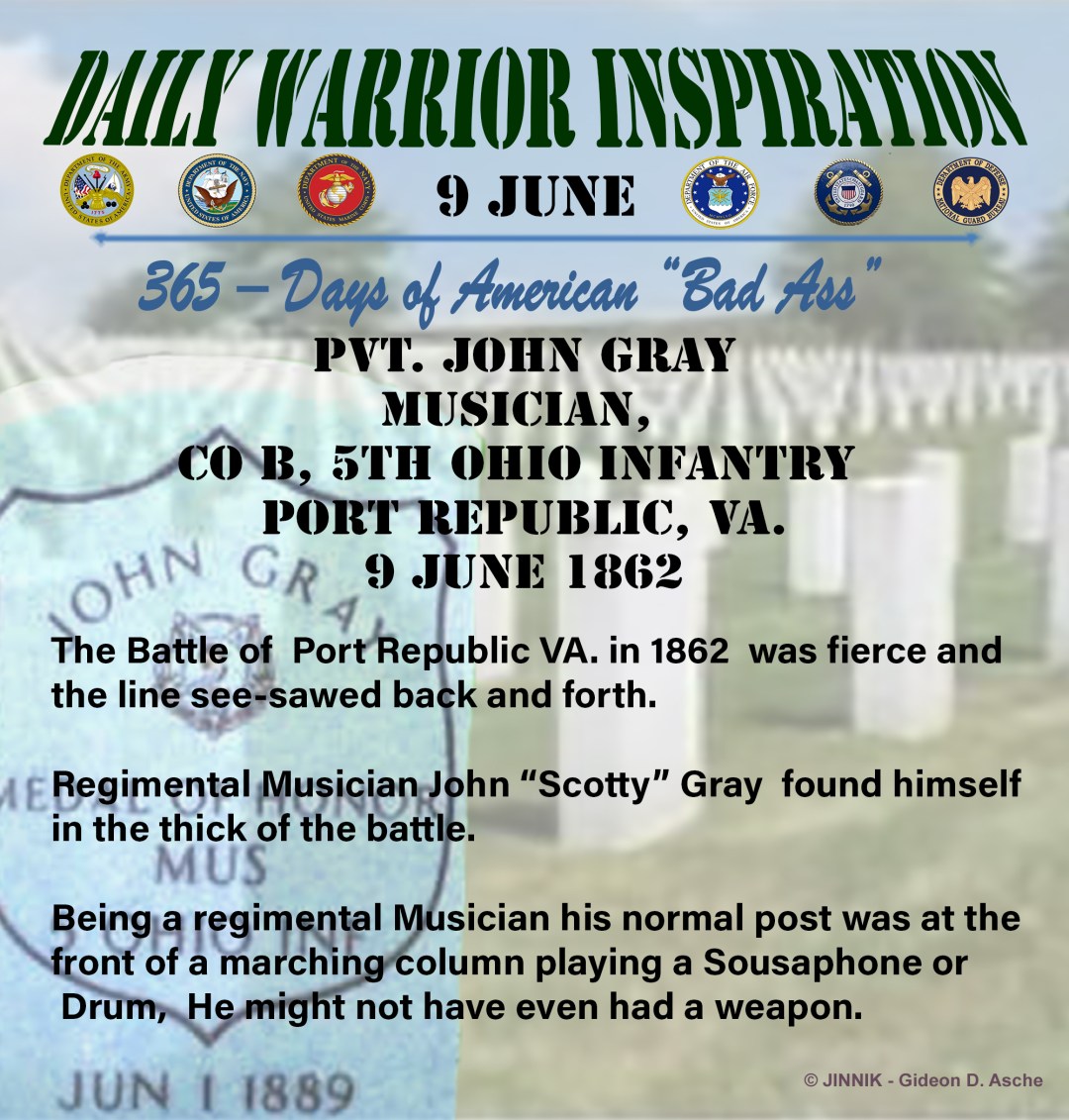 Gray found an unwounded horse and, in spite of withering Confederate fire – crossed the lines and stole one of Stonewall Jackson’s Cannon Delivered it to the rear where it was deployed and used against the enemy.