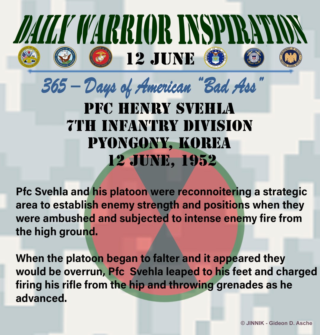 Private First Class Svehla, utterly disregarding his own safety, destroyed enemy positions and inflicted heavy casualties and destroying enemy bunkers and gun emplacements.