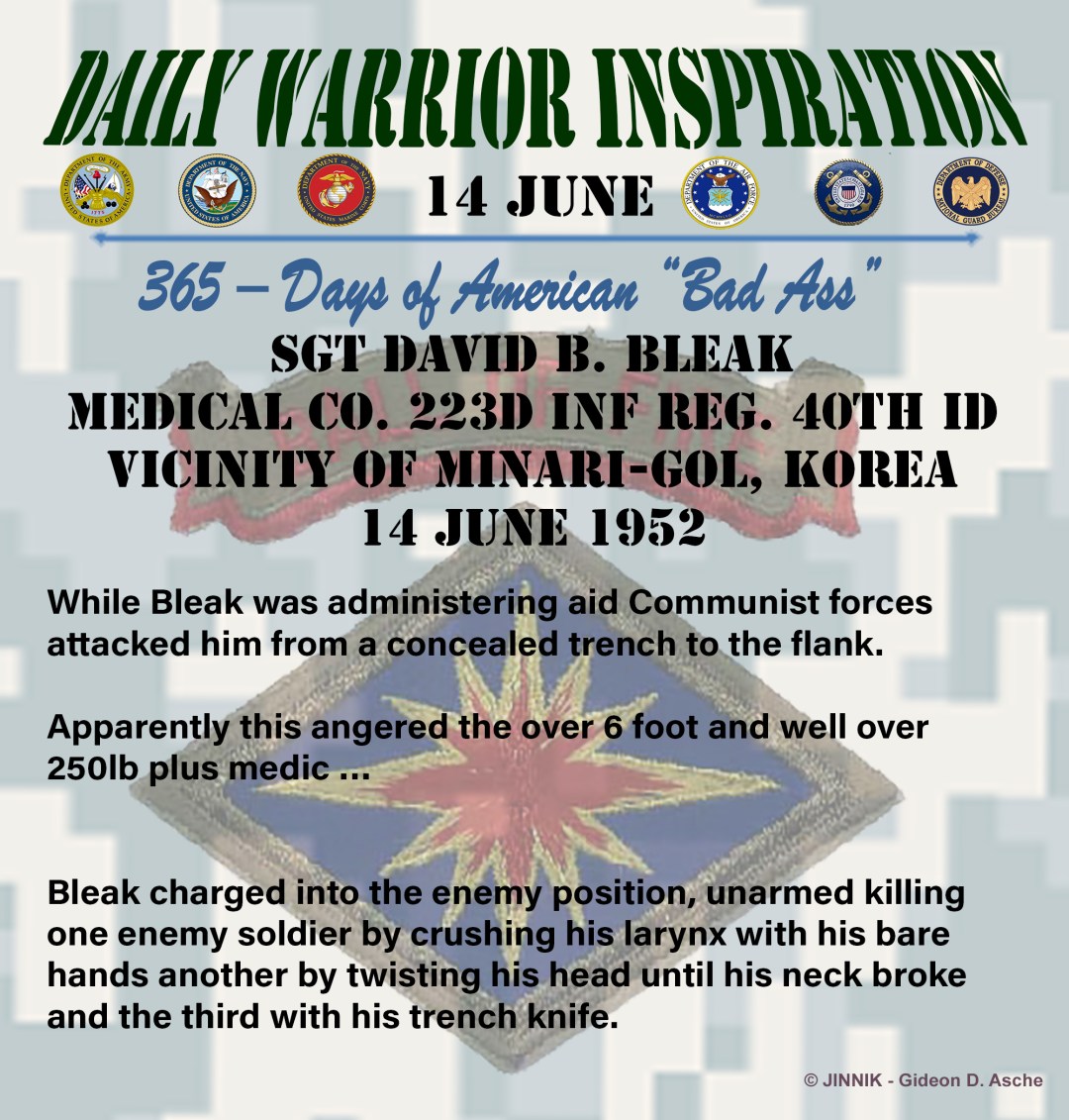 Witness counts describe the incident saying the big medic “grabbed both Koreans and banged their heads together”, never dropping the wounded soldier, then proceeding to medical aid with his patient in tow.