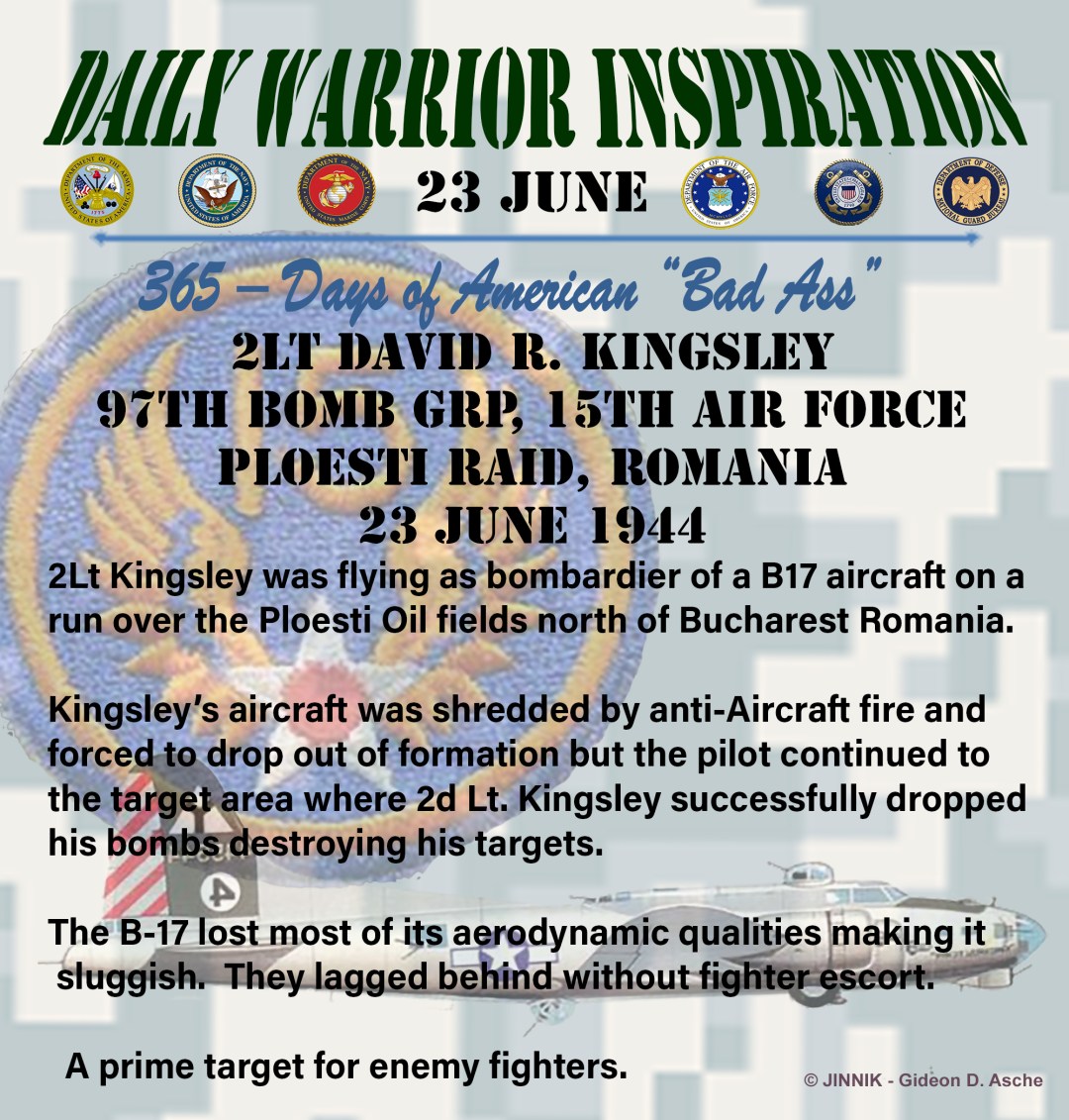Kingsley’s aircraft was shredded by anti-Aircraft fire and forced to drop out of formation but the pilot continued to the target area where 2d Lt. Kingsley successfully dropped his bombs destroying his targets.