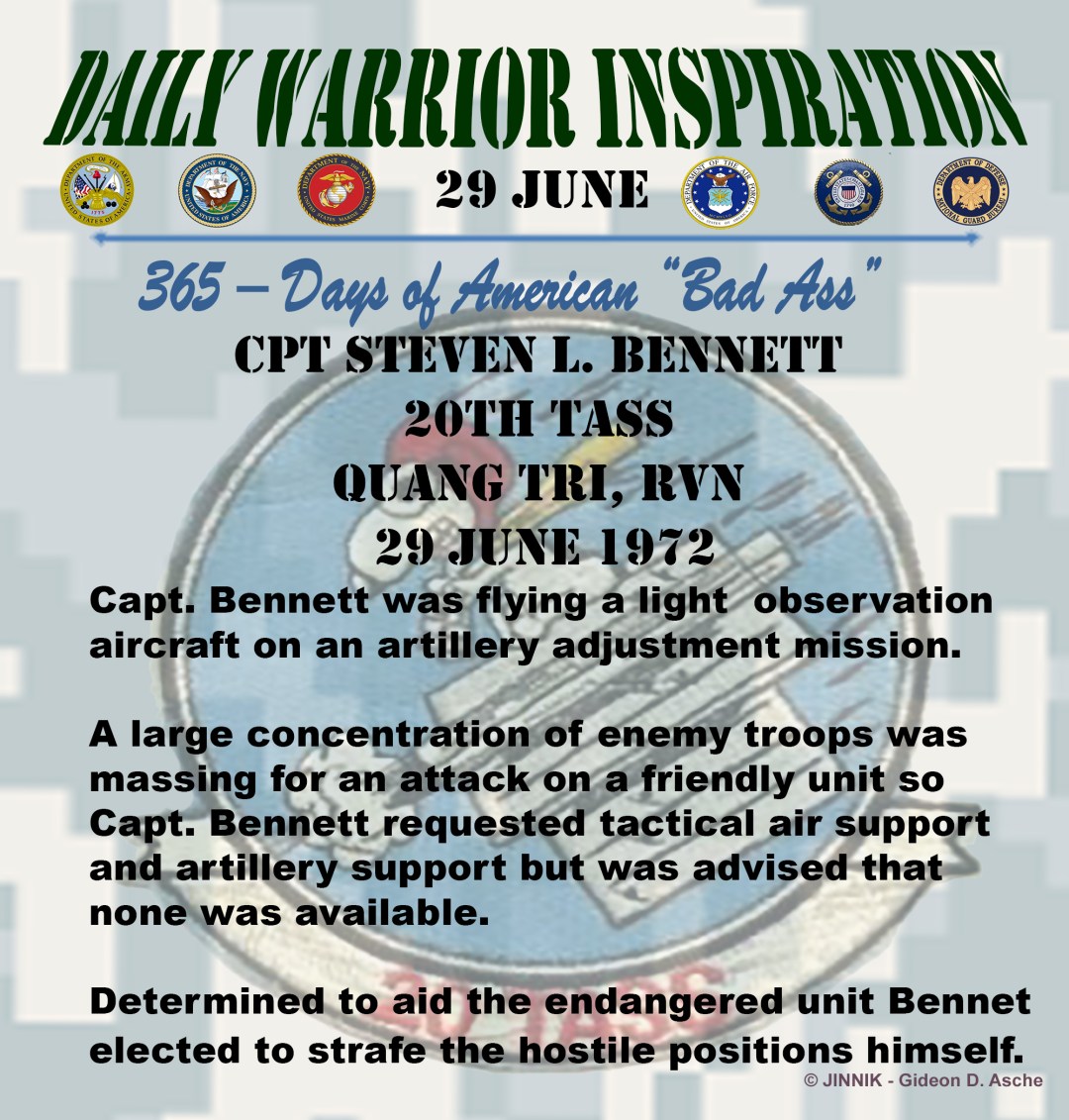 Determined to aid the endangered unit Bennet elected to strafe the hostile positions himself. After four strafing runs, the enemy force began to retreat but Capt. Bennet continued to attack and on his 5th pass the OV-10 was struck by a Surface to air missile.