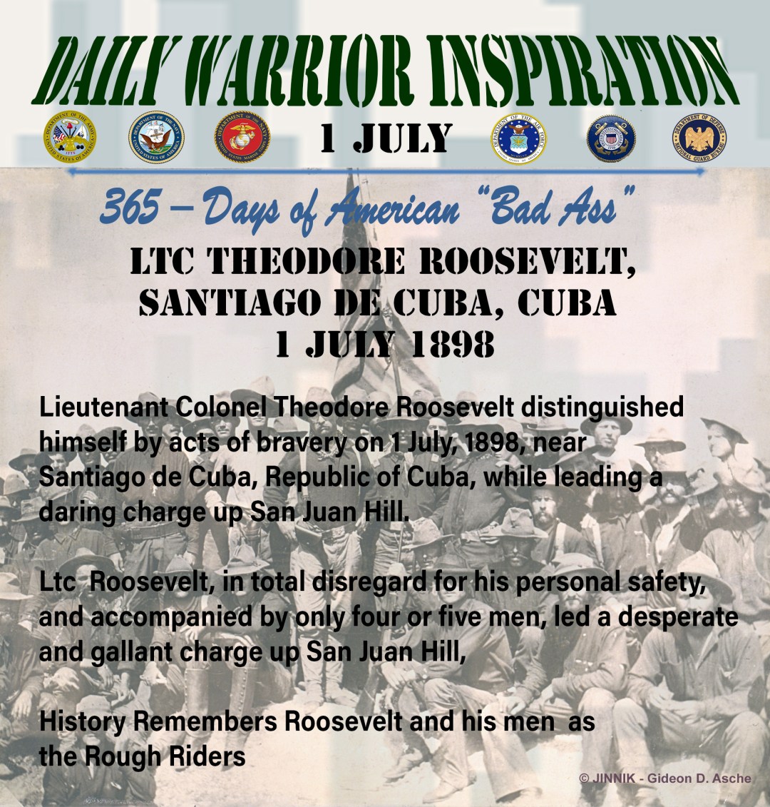 For conspicuous gallantry and intrepidity at the risk of his life above and beyond the call of duty: Lieutenant Colonel Theodore Roosevelt distinguished himself by acts of bravery on 1 July, 1898, near Santiago de Cuba, Republic of Cuba, while leading a daring charge up San Juan Hill. Lieutenant Colonel Roosevelt, in total disregard for his personal safety, and accompanied by only four or five men, led a desperate and gallant charge up San Juan Hill, encouraging his troops to continue the assault through withering enemy fire over open countryside. Facing the enemy’s heavy fire, he displayed extraordinary bravery throughout the charge, and was the first to reach the enemy trenches, where he quickly killed one of the enemy with his pistol, allowing his men to continue the assault. His leadership and valor turned the tide in the Battle for San Juan Hill. Lieutenant Colonel Roosevelt’s extraordinary heroism and devotion to duty are in keeping with the highest traditions of military service and reflect great credit upon himself, his unit, and the United States Army.