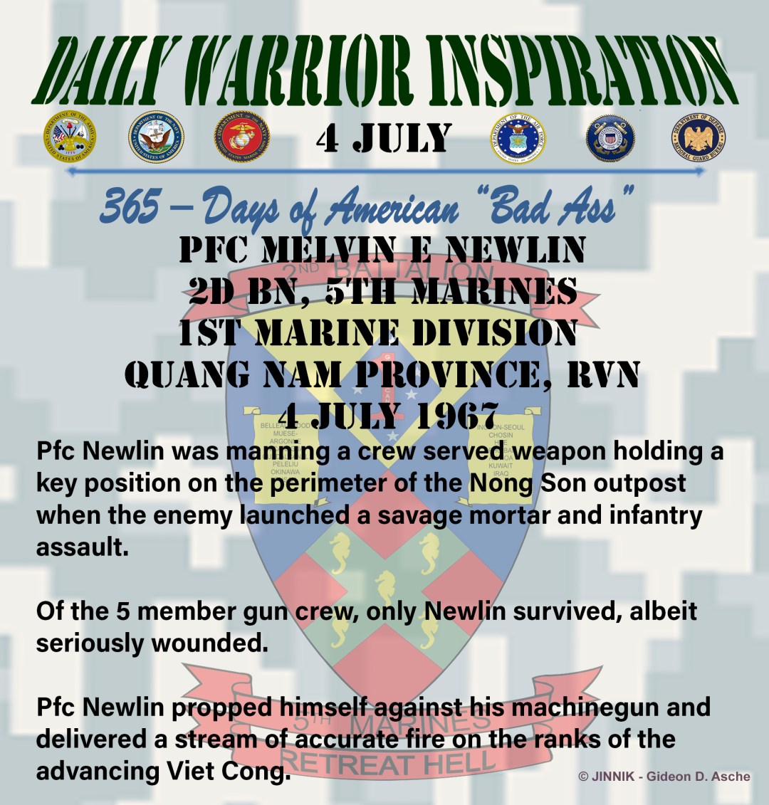 Pfc Newlin was a machine gunner manning a key position on the perimeter of the Nong Son outpost when the enemy launched a savage mortar and infantry assault.