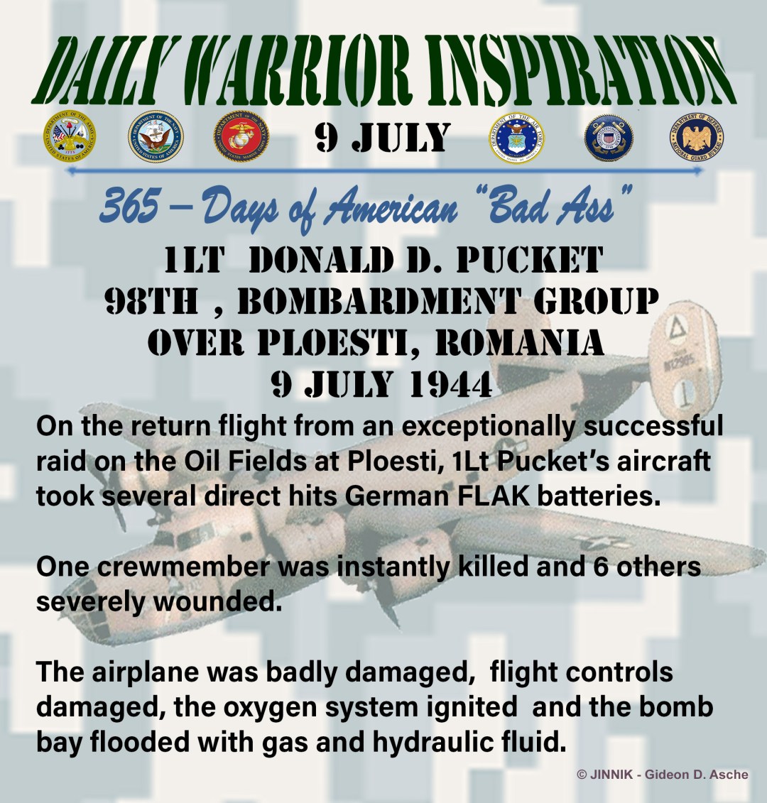 On the return flight from an exceptionally successful raid on the Oil Fields at Ploesti, 1Lt Pucket’s aircraft took several direct hits German FLAK batteries.
