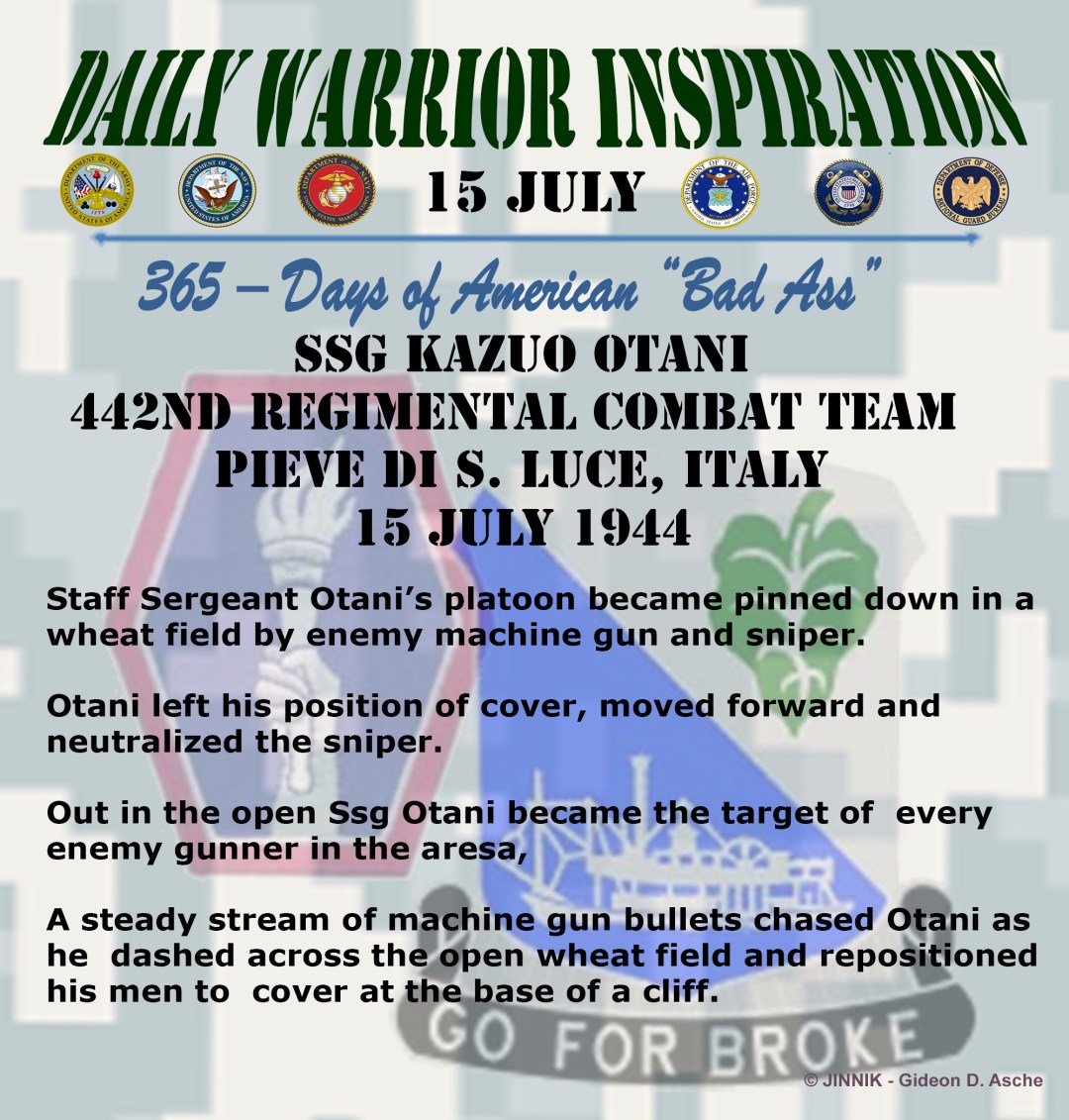 Staff Sergeant Otani’s platoon became pinned down in a wheat field by enemy machine gun and sniper. Otani left his position of cover, moved forward, and neutralized the sniper.