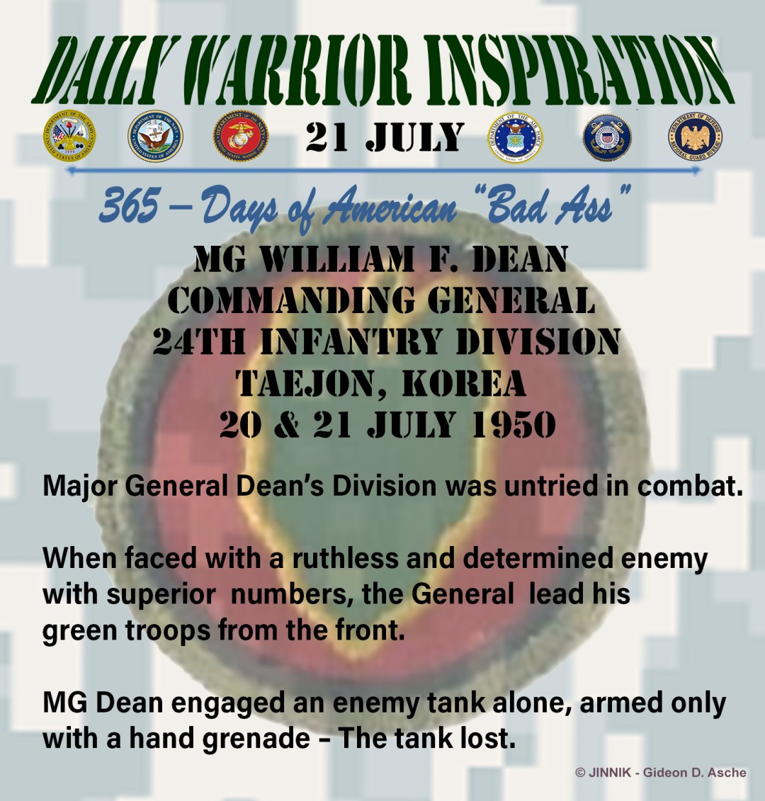 Major General Dean’s Division was untried in combat. When facing a ruthless and determined, highly trained and overwhelmingly enemy with superior numbers, the General led his green troops from the front.