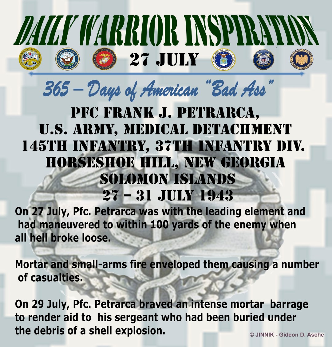 On 29 July, Pfc. Petrarca braved an intense mortar barrage to render aid to his sergeant who had been buried under the debris of a shell explosion. Pterarca dug him out, stabilized his condition then made sure he was evacuation.