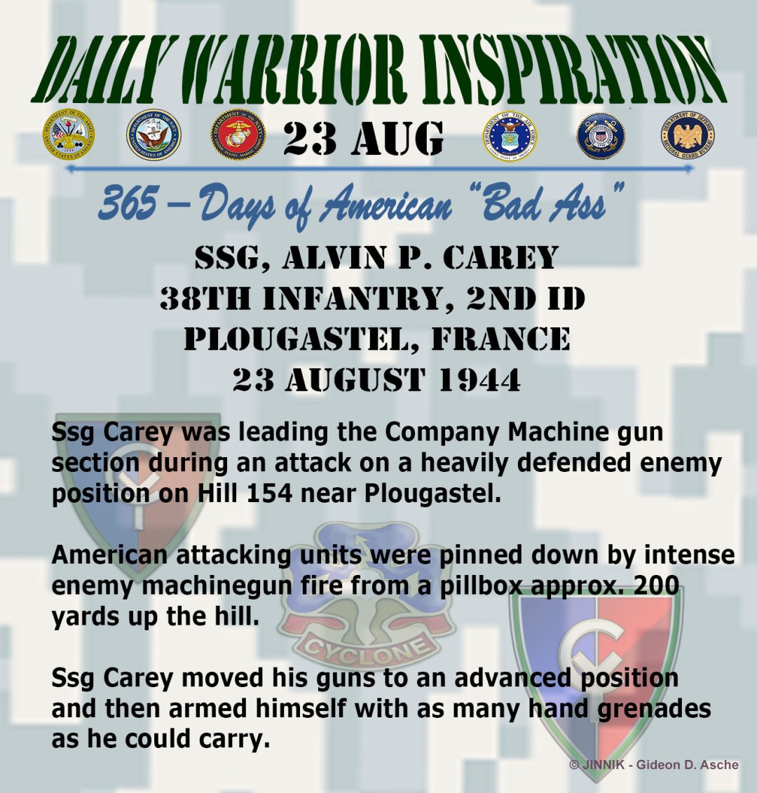 With absolutely ZERO regard for his own safety Carey low-crawled to the pillbox under unrelenting enemy fire; 150 meters out he ran across a German rifleman – he killed him and moved on.
