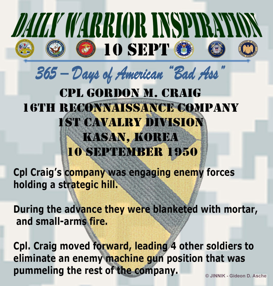 Cpl GORDON M. CRAIG 16th Reconnaissance Company 1st Cavalry Division Kasan, Korea 10 September 1950 CPL Craig, 16th Reconnaissance Company, distinguished himself by conspicuous gallantry and intrepidity above and beyond the call of duty in action against the enemy. During the attack on a strategic enemy-held hill his company’s advance was subjected to intense hostile … Continue reading 10 September